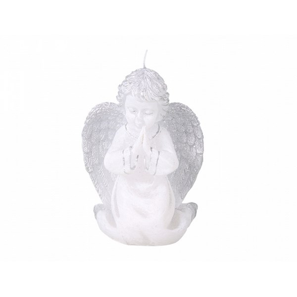 Biela sviečka v tvare kľačiaceho modliaceho sa anjelika so striebornými vláskami a krídlami. Ozvláštnite si s ňou váš interiér alebo ju niekomu darujte. Ako darček sviečka nikdy nesklame.