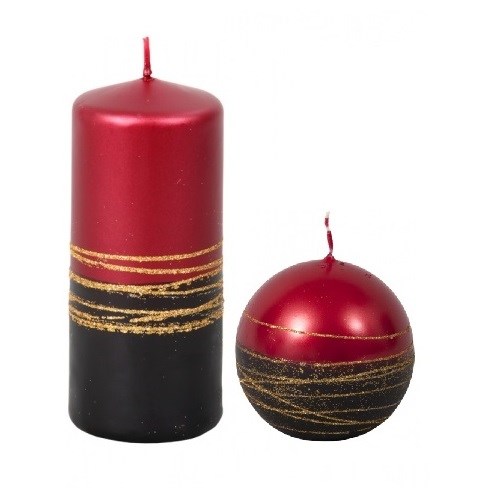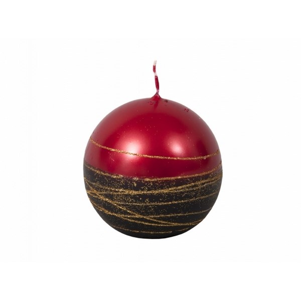 Vianočná sviečka v tvare gule napoly čierna a napoly červená zdobená v strede zlatými glitrovými prúžkami. Ozvláštnite si s ňou váš interiér alebo ju niekomu darujte. Ako darček sviečka nikdy nesklame.