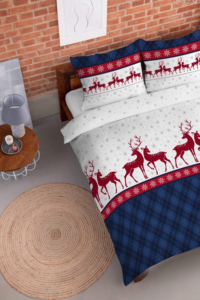 Teplý a na dotyk príjemný flanel s moderným vianočným dizajnom zdôrazní krásu a individualitu každej spálne. Vysoko kvalitné materiály a pevné spracovanie robia produkt odolným a praktickým pri používaní. Inovatívna technika farbenia zaisťuje ostrosť vzoru a farebnú stálosť.
