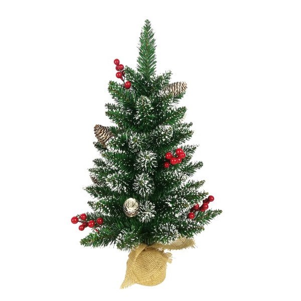 Ozdobte si váš domov touto krásnou dekoráciou zdobeného zasneženého stromčeka so šiškami a bobuľami. Spodná časť stromčeka je obalená v jute. Výborne doladí vašu sviatočnú tabuľu alebo aranžmán na poličke. Dekorácia je určená do interiéru.