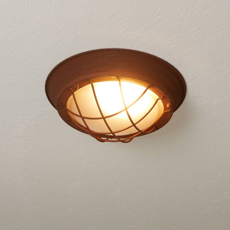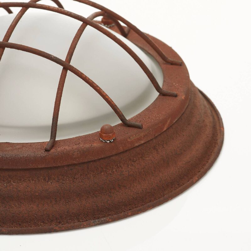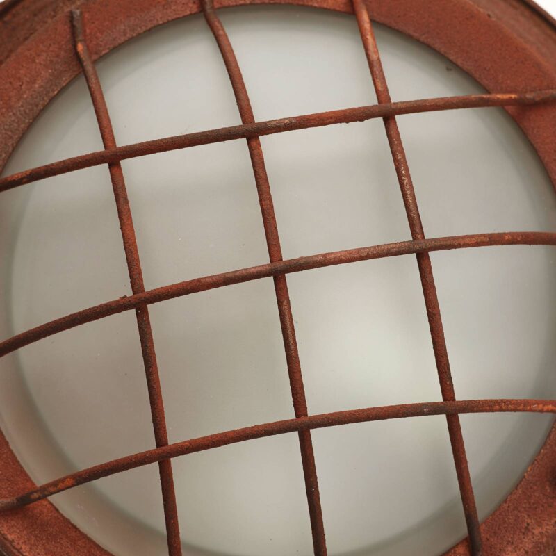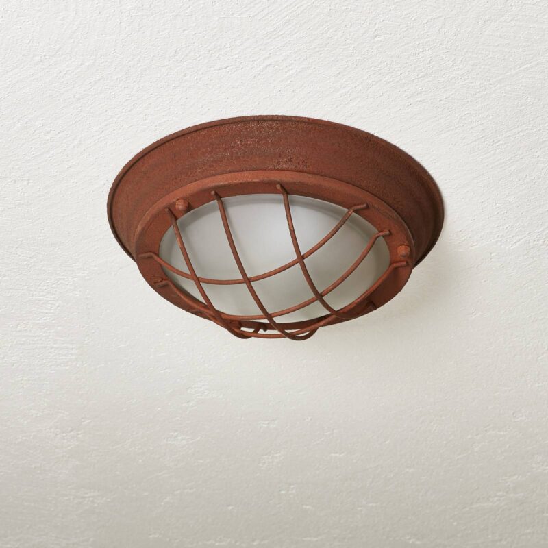 Okrúhle stropné svietidlo Typhoon Stropné svietidlo Typhoon, ktoré má stropný držiak čiernej a hrdzavej farby, sa ideálne hodí na kvalitné osvetlenie miestností zariadených vo vidiecko-rustikálnom štýle. Veľké sklenené tienidlo je obklopené ochrannou kovovou mriežkou, ktorá ešte viac zvýrazňuje vidiecko-rustikálny charakter celkového vzhľadu. Typhoon vyžaruje jemné veľkoplošné svetlo, vďaka čomu poskytne napríklad v obývačke alebo chodbe optimálne základné osvetlenie. Typhoon možno používať ako nástenné svietidlo.