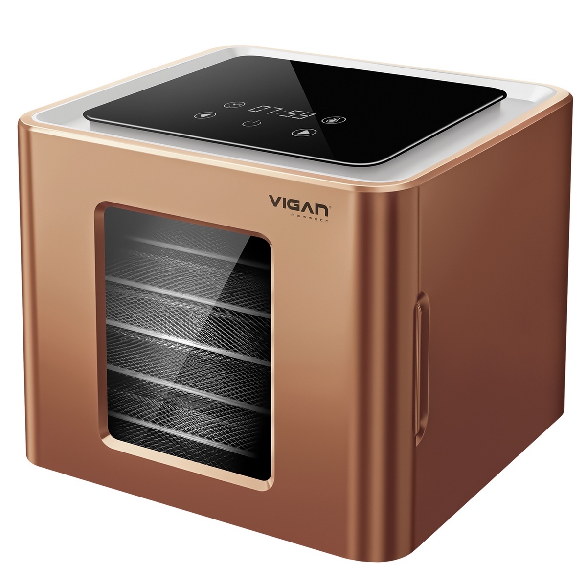 Výkonná teplovzdušná sušička potravín Vigan Mammoth ESP4DG v novom elegantnom dizajnovom prevedení – skrinka s čelnými uzatvárateľnými dvierkami. LED displej s pohodlným dotykovým ovládaním na veku sušičky. Príkon 400 W garantuje rýchle a efektívne sušenie ovocia, zeleniny, húb, rôznych druhov mäsa, byliniek a iných plodín. Vhodná aj pre výrobu domáceho jogurtu. Prírodnou konzerváciou sušička zaistí zachovanie vysokého obsahu vitamínov, stopových prvkov a minerálov (až okolo 97 % z pôvodného množstva), a to všetko bez použitia chémie. Nepriehľadné prevedenie skrine sušičky zabraňuje priamemu prístupu svetla, čo môže mať neblahý vplyv na obsah zachovania živín v sušených potravináchVlastnosti a špecifikácia: