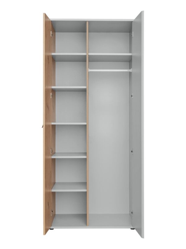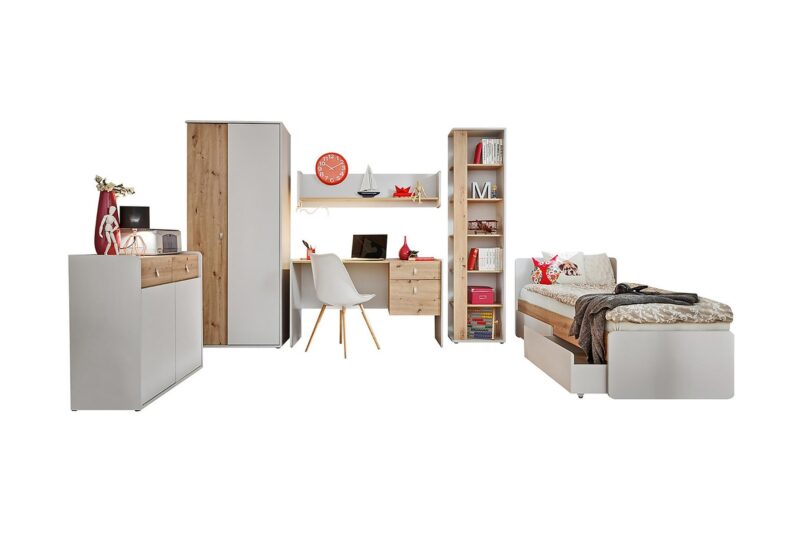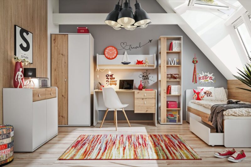 Jedinečný a jednoduchy dizajn ponuka sektor Vitória, vhodný nie len do detských izieb ale aj študentských izieb. Je navrhnutá v trendy farbách sivá perla / dub Artisan s originálnymi plastovými rúčkami, ktoré dodávajú nábytku moderný dizajn.Zostava pôsobí veľmi nenápadne a vkusne,preto je možné využiť rovnako v dievčenských či chlapčenských izbách a nebude problém ju kombinovať s rôznymi doplnkami.Na výrobu bola použita kvalitná laminovaná drevotrieska s hrúbkou 16 mm a 18 mm.Zostava obsahuje:Šatníková skriňa SU: šírka: 84 cm, výška: 198 cm, hĺbka: 57 cm,Regál RG1: šírka: 49 cm, výška: 198 cm, hĺbka: 35 cm,Počítačový stôl BK: šírka: 134 cm, výška: 78 cm, hĺbka: 57 cm,Komoda SB1: šírka: 94 cm, výška: 86 cm, hĺbka: 38 cm,Nástenná polica PW1: šírka: 134 cm, výška: 33 cm, hĺbka: 24 cm,Posteľ BT: dĺžka: 205 cm, šírka: 99 cm, výška: 78 cm,Dodávame v demonte,pričom montáž je veľmi jednoduchá.