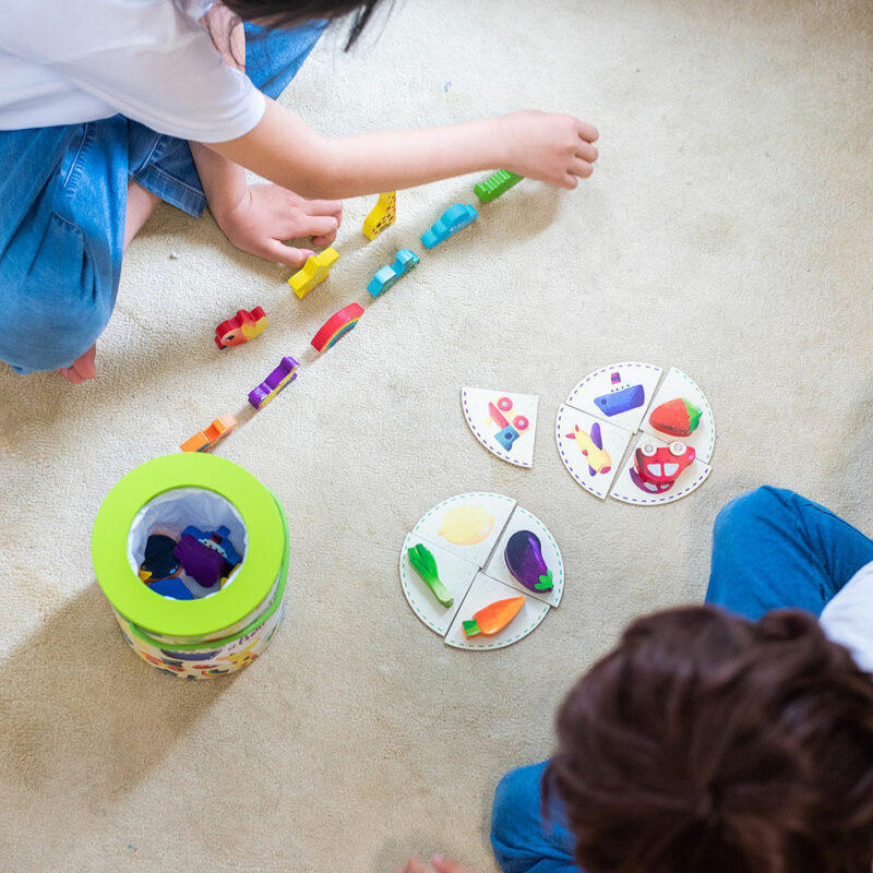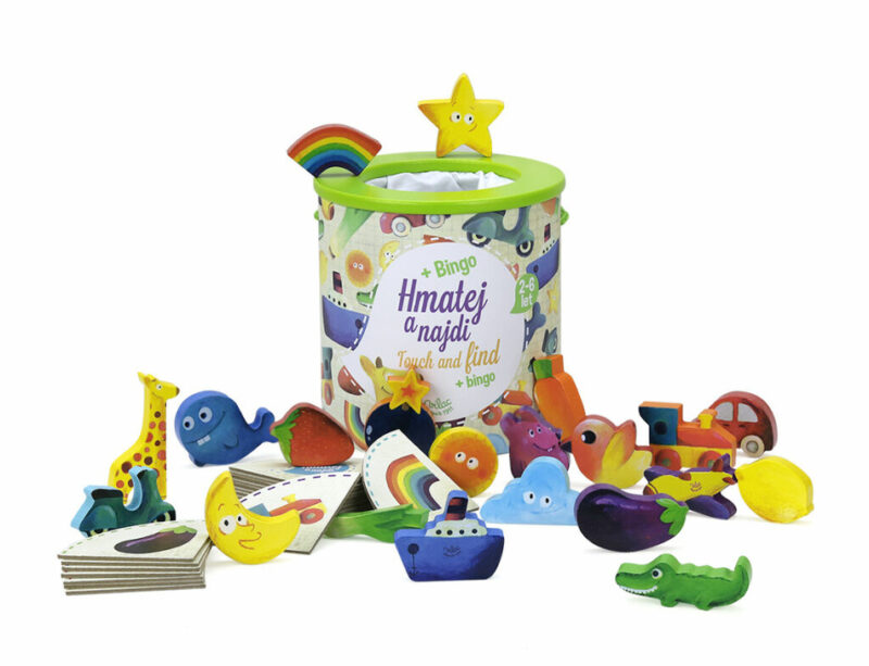 20 kartičiekNávod k hre: Hmataj a nájdi + bingo: Prvý hráč si vezme kartu z kôpky. Potom musí siahnuť do vrecka a podľa hmatu nájsť drevený dielik, ktorý zodpovedá obrázku na karte. Ak vyberie správny dielik, kartu si ponechá a na rade je druhý hráč, ktorý opäť začína ťahaním karty z kôpky. Ak ale prvý hráč vyberie nesprávny dielik, musí svoju kartu odovzdať ďalšiemu hráčovi, ktorý sa musí pokúsiť nájsť správny dielik. Po každom kole sa dieliky vracajú späť do vrecka. Keď už na kôpke nezostáva žiadna karta, určí sa víťaz. Vyhráva hráč s väčším počtom kariet. Pozor! Ak jeden z hráčov náhodou vytiahne dielik v tvare muchotrávky, musí všetky svoje karty vrátiť na kôpku!Aby sa deti lepšie zoznámili s hmataním predmetov, môžete upraviť pravidlá podľa vlastného uváženia: 1 – Začnite s malým množstvom drevených dielikov. 2 – Dovoľte im pozrieť sa do vrecka. 3 – Potom hru opäť urobte o niečo ťažšiu, nedovoľte deťom nazerať do vrecka. 4 – Pridajte do vrecka viac dielikov. 5 – Nakoniec, až si deti na hru zvyknú, hrajte podľa tradičných pravidiel. Bingo variácia: zložte 4 karty do kruhu a vytvorte jeden alebo viac herných polí pre každého hráča. Jeden z hráčov alebo rodič vytiahne dielik z vrecka a vyvolá ho. Hráč, ktorý má kartu zodpovedajúcu tomuto vyvolanému dieliku, si ho vezme a položí na svoju kartičku. Hráč, ktorý ako prvý zaplní svoje herné pole, vyhráva!