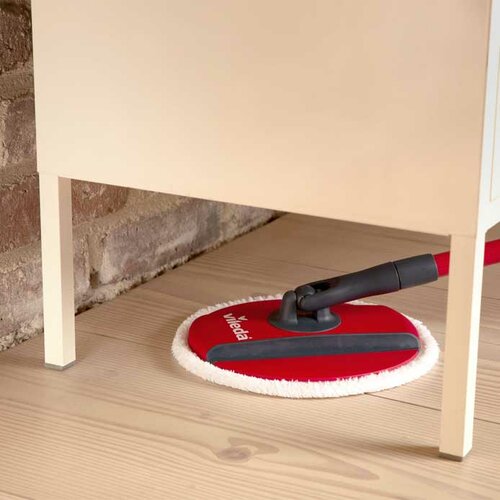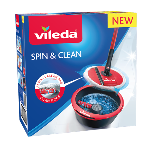 Vileda Spin & Clean je rotačný mop s plochou umývacou hlavicou okrúhleho tvaru. Priestranné vedro naplníte vodou až po vyznačenú rysku a pridáte váš obľúbený čistiaci prostriedok. Mop pomaly stlačíte na tŕň nachádzajúci sa uprostred vedra, tým sa hlavica roztočí a zospodu ju umyje voda. Tento unikátny systém zabezpečí, že bude mop úplne dokonale zbavený všetkých nečistôt a pripravený na ďalšie použitie. Ak mop na tŕň stlačíte s vyššou intenzitou, dosiahnete efektívneho vyžmýkania. Nehrozí teda, že budú pri vytieraní odkvapkávať kvapky vody na podlahu.Technické parametre a špecifikácie: