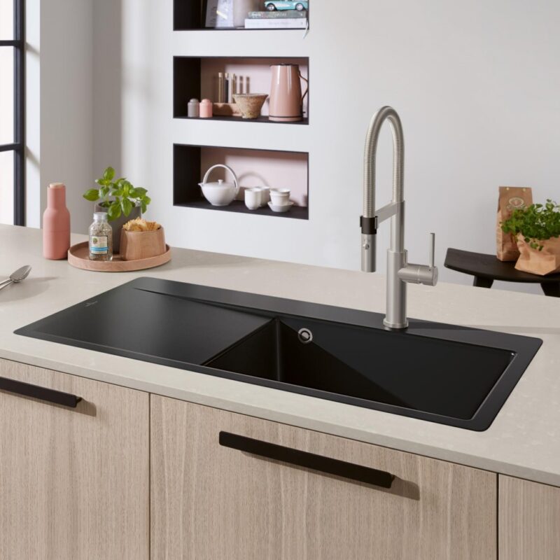Drezová páková batéria s flexibilným ramenom a odnímateľnou sprchou, nerez mat, materiál masívny nerez, kartuše s keramickým tesnením Batérie Villeroy & Boch sú vyrobené s masívnou nerezovej ocele, ktorá zaisťuje vysokú kvalitu a dlhú životnosť. Batérie majú povrchovú úpravu odolnú proti odtlačkom prstov a mastným škvrnám. Všetky batérie Villeroy & Boch sú vybavené kartušou s keramickým tesnením pre hladký chod a dlhú životnosť batérie. Materiál: masívna nerezová oceľ Povrchová úprava: nerez mat Kartuša s keramickým tesnením Odnímateľná sprcha na flexibilnom ramene s magnetickým uchytením Prepínanie medzi prúdom a sprchou pomocou tlačidla Otočný kĺb koncovky hadice Montáž: jednootvorová (priemer otvoru 35 mm) Výška batérie: 490 mm Dĺžka výtoku: 185 mm Otočná o 360 ° Uhol otvorenia páky: 25° Maximálny prietok (prúd / sprcha): 5,4 / 4,8 l/min. Flexibilná pripojovacia hadica, dĺžka 600 mm Hmotnosť: 2,76 kg(GT) Ean: 4062373800133