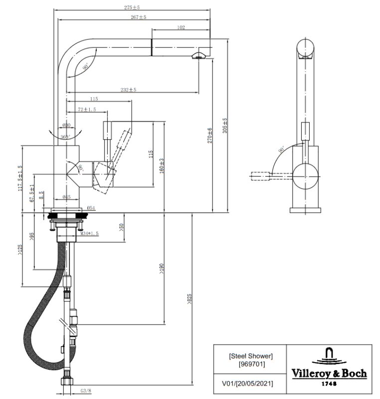 Drezová páková batéria s výsuvnou sprchou, antracit, materiál masívny nerez, kartuše s keramickým tesnením Batérie Villeroy & Boch sú vyrobené s masívnou nerezovej ocele, ktorá zaisťuje vysokú kvalitu a dlhú životnosť. Batérie majú povrchovú úpravu odolnú proti odtlačkom prstov a mastným škvrnám. Všetky batérie Villeroy & Boch sú vybavené kartušou s keramickým tesnením pre hladký chod a dlhú životnosť batérie. Materiál: masívna nerezová oceľ Povrchová úprava: antracit Kartuša s keramickým tesnením Výsuvná sprcha Montáž: jednootvorová (priemer otvoru 35 mm) Výška batérie: 305 mm Dĺžka výtoku: 232 mm Otočná o 360 ° Uhol otvorenia páky: 25° Maximálny prietok: 11,7 l/min. Flexibilná pripojovacia hadica, dĺžka 600 mm Hmotnosť: 1,73 kg(GT) Ean: 4062373713181