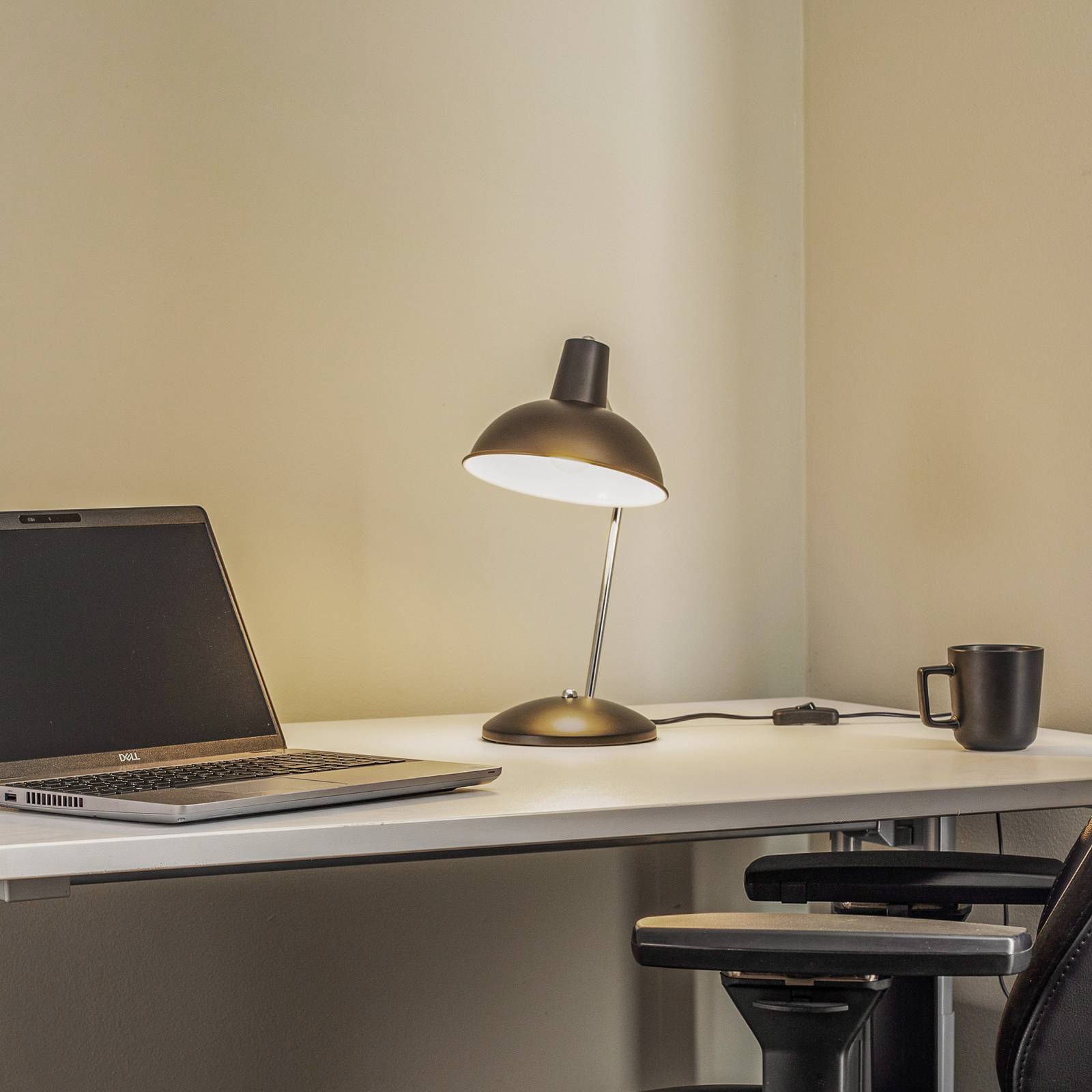 Čierna stolová lampa Jamelia s vintage charakterom Všetky súčasti stolovej lampy Jamelia, ktorá je väčšinou matne čierna, sú vyrobené z ocele a svetlo svieti smerom nadol, kde je sústredené tak, aby bolo ideálne na čítanie. Tienidlo lampy sa dá nastaviť pomocou kĺbu, takže svetlo svieti presne tam, kde je potrebné. Celkovo je stolová lampa ideálna na čítanie a na rozdiel od základne a tienidla, ktoré sú čierne, je tyč v strednej časti v lesklom chróme. Lampa sa dá ovládať pomocou vypínača na podstavci a ploché, okrúhle kovové tienidlo má zvláštny vintage charakter a pripomína svetelné zdroje z polovice minulého storočia, čo znamená, že lampu Jamelia možno nepochybne zaradiť do kategórie vintage.