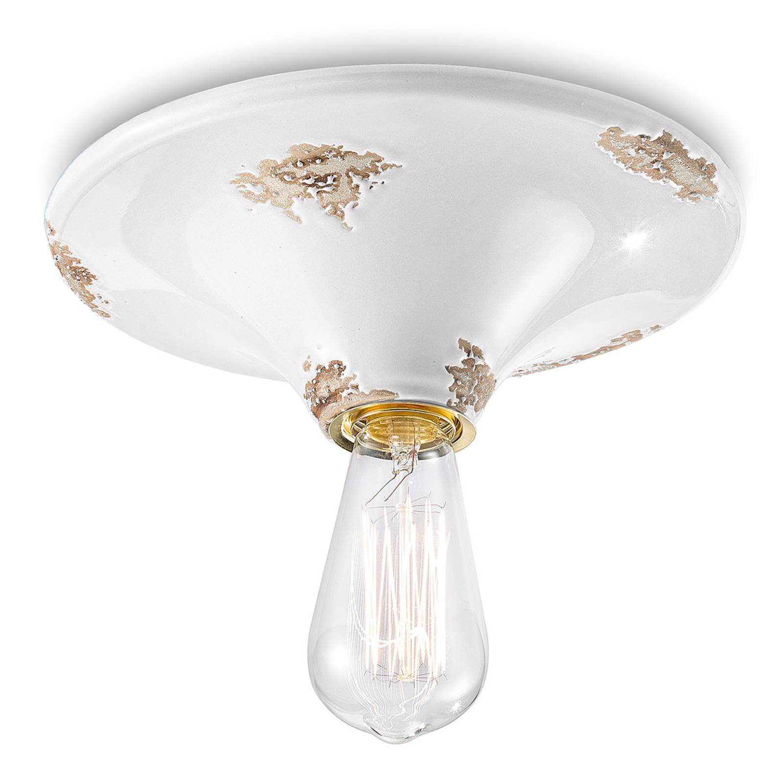 Keramické stropné svietidlo C134 s povrchovou úpravou vintage lak Stropné svietidlo C134 sa jednoducho zaobíde bez tienidla, pretože pozostáva len z držiaka lampy inštalovaného v keramickej stropnej konzole – to je všetko, čo toto stropné svietidlo obsahuje. Práve táto jednoduchosť a lesklý vintage povrch pripomínajúci časy minulé dodávajú svietidlu jeho charakter. Minimalistický dizajn je definovaný štýlom vintage, ktorý v súčasnosti zažíva oživenie. Stropné svietidlo C134 vyzerá obzvlášť štýlovo, keď je vybavené žiarovkou Rustika s technológiou žiaroviek alebo optikou z uhlíkových vlákien. Vyrobené v Taliansku.