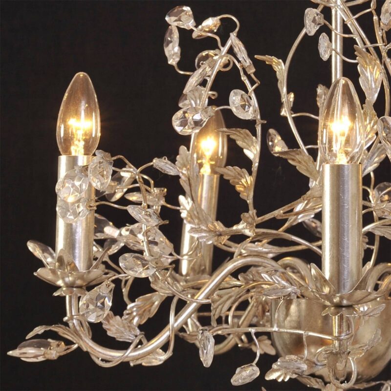 Postriebrený visiace lustre Buono Postriebrený visiace lustre Buono bol bohato zdobený a láme svetlo prostredníctvom tyčí zo strieborného listu a piatich svetiel pripomínajúcich sviečky a nespočetné množstvo bezfarebných kryštálov. Tento visiace lustre by nemal chýbať pre sviatočné prostredie, najmä preto, že vďaka vysokokvalitnému spracovaniu je vrcholom každého zariadenia.
