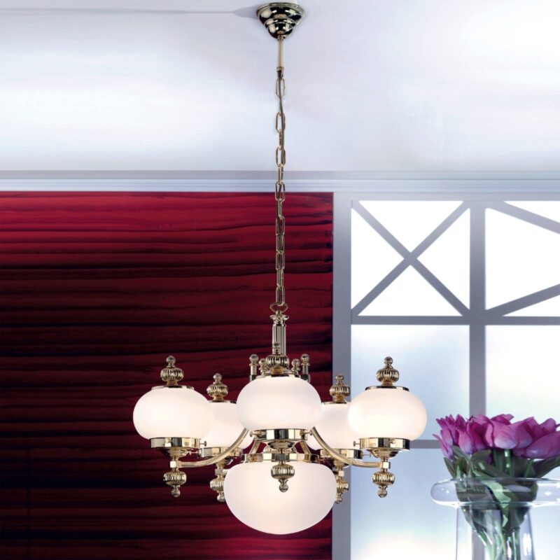 Luster Delia so šiestimi žiarovkami, tienidlami z opálového skla a mosadznou konštrukciou Krásny luster Delia vzbudzuje elegantnú atmosféru viedenských kaviarní. Veľké tienidlo na spodnej strane lustra je skutočným pútačom. Okolo neho je rozmiestených päť cibuľovitých tienidiel z opálového skla. Konštrukcia svietidla má jemne vrúbkovanú štruktúru. Je vyrobená z mosadze a má leštený povrch. Delia vyžaruje ušľachtilý lesk a príjemné neoslepujúce svetlo. Spolu so závesom má luster dĺžku 115 cm. Optimálne miesto nachádza v miestnostiach s vysokým stropom. Delia je rakúsky výrobok, ktorý môže dokonale obohatiť vkusne zariadené obytné priestory. Tento kvalitne spracovaný luster skvele zapadne aj do moderných kaviarní alebo hotelov. Svojmu okoliu dodáva šarmantnú a exkluzívnu atmosféru.