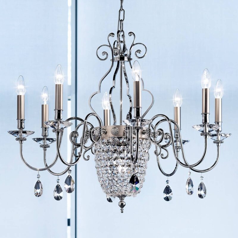 Elegantia – osemramenný visiace lustre so šumivými závesmi Elegantia je visiace lustre v klasickom tvare, ktorý dodáva osobitnú charizmu kombináciou rámu vyrobeného z pochrómovaných ramien lampy a dekoratívnych prvkov a niklovo matne tvarovanej strednej časti a hriadeľov na sviečky. Brúsené sklenené prvky v malých, okrúhlych tvaroch a v tvare veľkých kvapiek tvoria zavesenie lustra a premieňajú ho na trblietavý ľahký predmet nad stolom. Vyrobené v Taliansku – tento názov nesie visiace lustre Elegantia, kvalitný výrobok talianskeho osvetlenia. Vysoko kvalitné materiály a vynikajúce spracovanie charakterizujú svetlá od tohto talianskeho výrobcu.