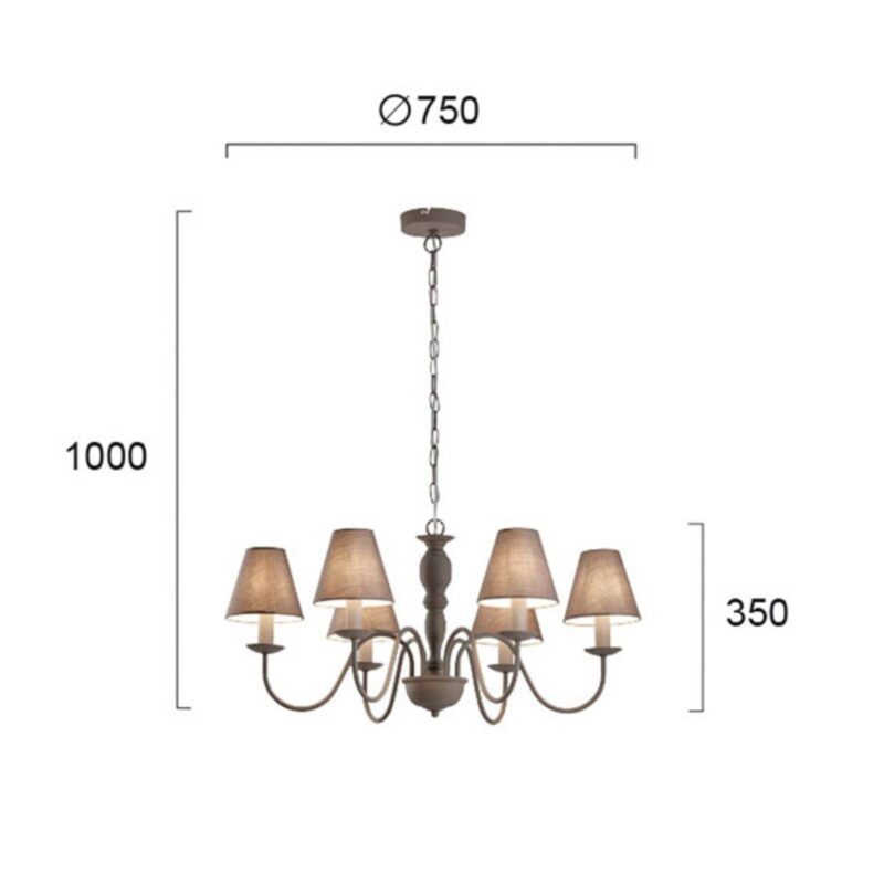 Elegantný visiace lustre Fatima so šiestimi plameňmi a látkovými odtieňmi visiace lustre Fatima so šiestimi plameňmi svojim rustikálnym dizajnom okamžite upúta pozornosť. visiace lustre sa skladá zo šiestich ramien a tienidiel vyrobených z látky a držaných v šedej farbe. Štýlovo zakrivený rám je možné dobre kombinovať v štýle vidieckeho domu a slúži ako elegantný dekoratívny prvok. Šesť žiaroviek s päticou E14 (nie je zachovaných) zaisťuje veľmi dobré osvetlenie miestnosti.