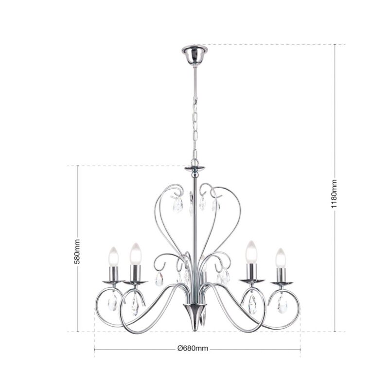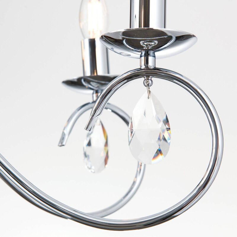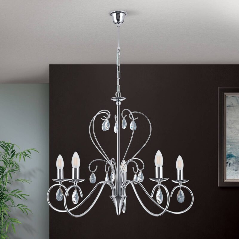 Vznešený luster Alessia s početnými prvkami z olovnatého krištáľu AsfourAlessia je pôsobivý filigránový luster, ktorý očarí svojím starožitným dizajnom. Na pochrómovanom ráme sa nachádza päť sviečok, ako aj prvky z trblietavého olovnatého krištáľu Asfour, ktoré z lustra robia ušľachtilý šperk do klasického interiéru.