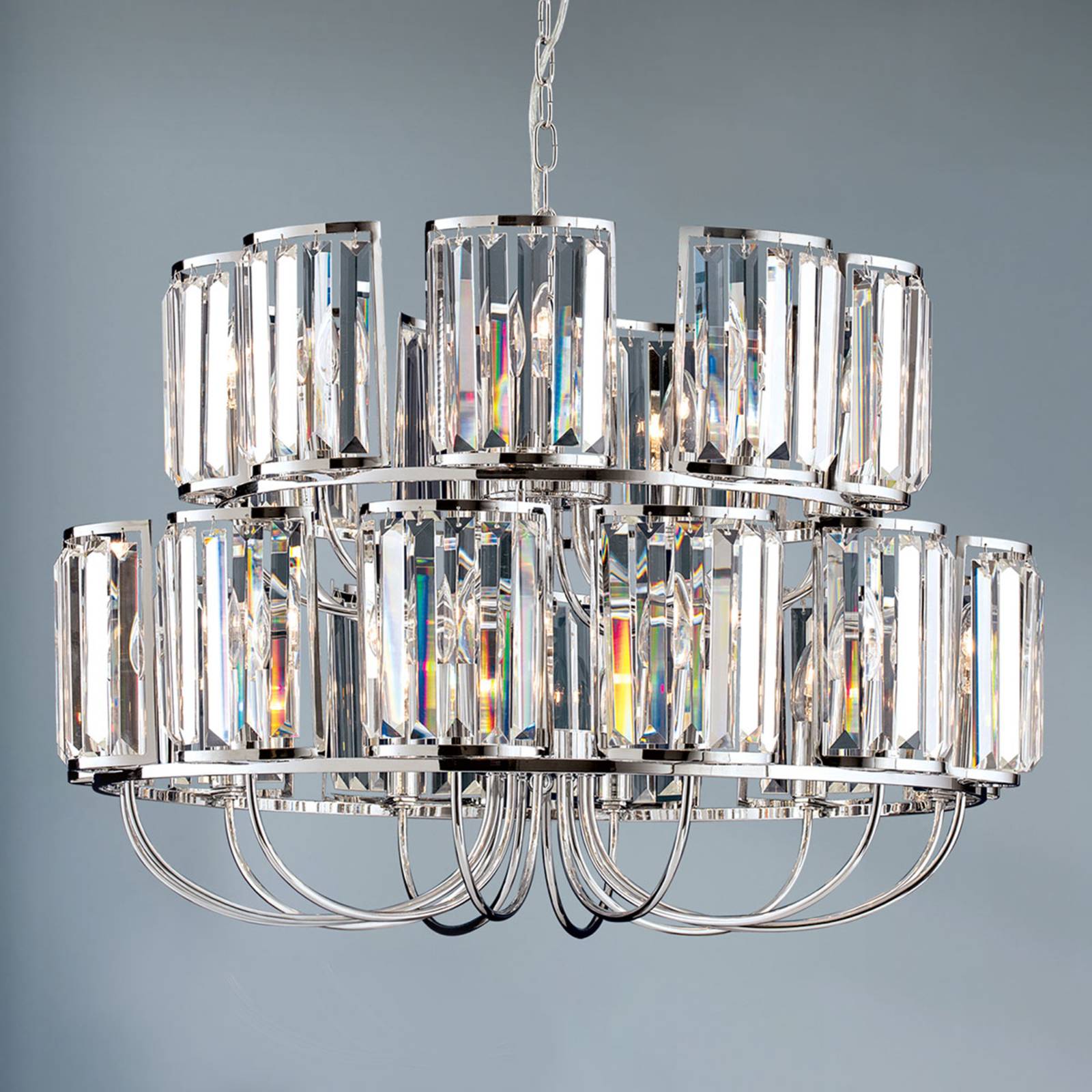 Trblietavý luster Gstaad zdobený krištáľmi K9 – 21 žiaroviek Luster Gstaad je vybavený celkovo 21 zdrojmi svetla rozmiestnenými na dvoch úrovniach, scenériu ktorých dokonale zdobia krásne krištále. Kovové prvky lustra majú lesklý pochrómovaný povrch, čo zvyšuje trblietavý efekt. Celkovo moderne pôsobiaci luster Gstaad sa hodí k mnohým štýlom zariadenia a svojím slávnostným leskom obohatí každý obytný priestor. Žiarovky nie sú súčasťou balenia – dajú sa objednať ako príslušenstvo. Výška zavesenia sa dá nastavovať len pri montáži.