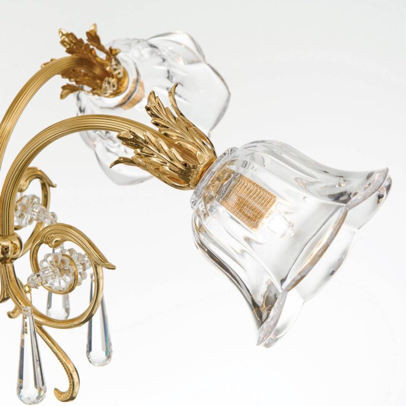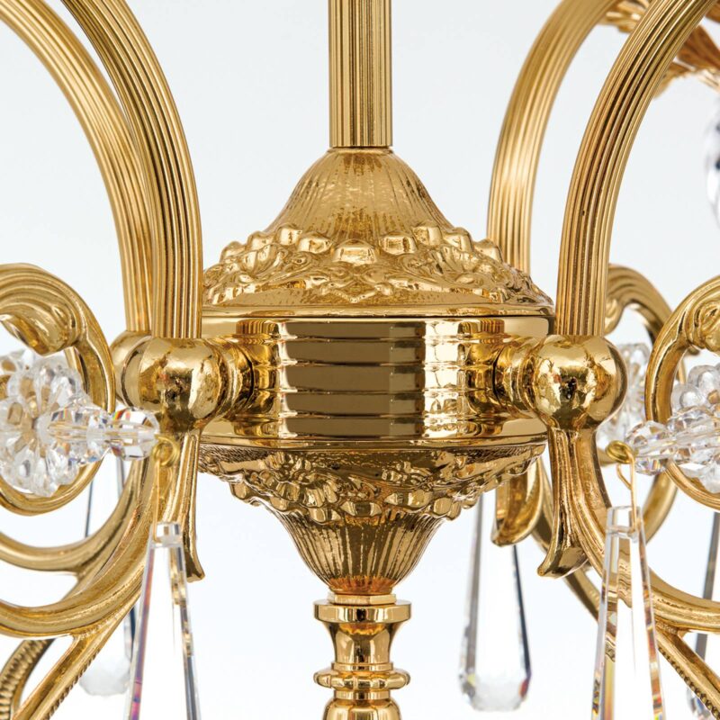Luster KAISA pozlátený 24-karátovým zlatom s množstvom krásnych detailov Tento luster nezapôsobí len svojím detailným vzhľadom, ale rovnako aj funkčnosťou a nápaditosťou: KAISA sa totiž v závislosti od vkusu a výšky priestoru dá používať ako visiaci luster alebo pevne nainštalovaná stropná koruna! Pohľad jeho pozorovateľa upútajú nespočetné detaily a ručne brúsené sklenené kalichy (24 % PBO), ktoré sa svojím tvarom podobajú na kalichy kvetov, a tak pripomínajú obľúbený florentský štýl. Nezameniteľný je však tento luster zo série KAISA vďaka elegantne pozláteným filigránskym liatinovým častiam v tvare koruny, ktorá sa týči nad každým kalichom a vyvoláva asociáciu s rozprávkovými scénami. Pri týchto svietidlách sú stredobodom kvalita, elegancia, hodnotné spracovanie a dlhá životnosť. Tu sa spája kreativita dizajnéra a rakúska remeselná zručnosť do výrobkov, ktoré sú uznávané po celom svete. Lustre tohto výrobcu sa celé vyrábajú v Rakúsku už od roku 1948, čo je tiež zárukou dlhodobej dostupnosti náhradných dielov.
