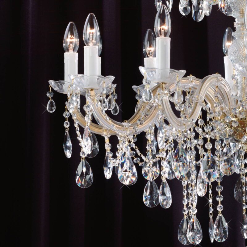 Pompézny luster THERA so svetlami v tvare sviečok Luster s priemerom 90 cm zaujme množstvom svetelných zdrojov v tvare sviečok, ktoré po zapnutí vytvárajú v celej miestnosti útulnú atmosféru. Farby a tvary vytvárajú harmonické umelecké dielo a pripomínajú kniežacie časy. Po celom zlatom ráme veľmi vysokého lustra sú dokonale brúsené sklenené kamene, ktoré visia smerom nadol a poskytujú nekonečné odlesky. Vhodné pre LED alebo úsporné žiarovky. Svetlá sa vyrábajú tradičným spôsobom. Vďaka viac ako šesťdesiatročným skúsenostiam je výrobca obľúbený po celom svete