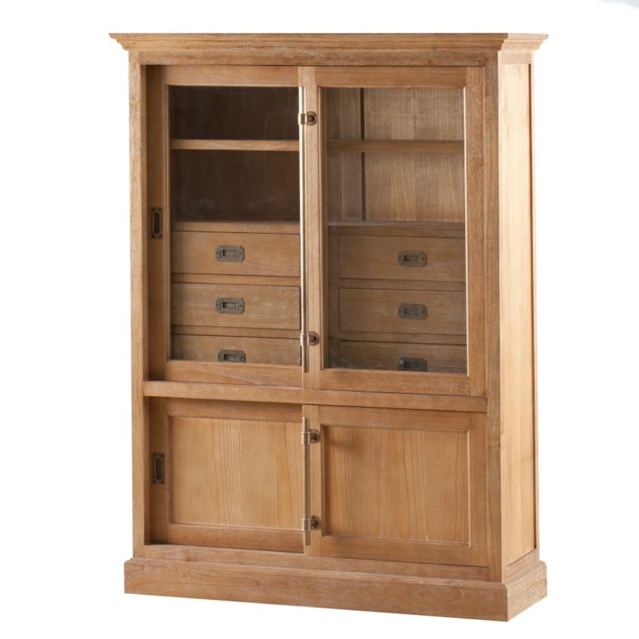 Drevená vitrína prírodnej farby s delenými sklenenými dvierkami a v spodnej časti s malými masívnymi dvierkami s mimoriadne originálnymi mosadznými vertikálnymi lištami. Stred komody vypĺňajú 2 hrubé police a 6 zásuviek s kovovým kovaním. Nábytok vyrobený z tichomorského duba, farba – rustikálna prírodná sivá.Materiál: tichomorský dubRozmery: Š 115 cm, D 40 cm, V 159 cmFarba: rustikálna prírodná sivákovanie: kov