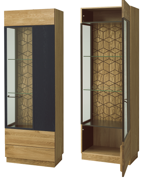 Vitrína MOZAIK vás zaujme svojim elegantným a zároveň luxusným prevedením. Je zo sektoru MOZAIK, vďaka ktorému si poskladáte vašu obývačku podľa predstáv.Je vyrobená z lešteného a olejovaného masívneho dreva. Farebné prevedenie: dub/čierna matná. Úchyty sú v čiernej matnej farbe, vyrobené z kovu.Vitrína je jednodverová. Vo vnútri sa nachádza 5 políc. Dvere vitríny sa otvárajú do pravej strany. V ponuke je aj vitrína s otváraním vľavo. LED osvetlenie nie je súčasťou. Je možné si ho dokúpiť (viď. doporučené produkty).Sektorový nábytok MOZAIK vám ponúka moderný dizajn a kvalitné prevedenie. Prírodná vôňa masívneho dreva a dlhá životnosť nábytku vás presvedčia, že nábytok MOZAIK je to najlepšie riešenie. Nábytok sa ľahko kombinuje s akýmkoľvek interiérom. Vďaka svojmu prevedeniu zútulní vašu obývaciu miestnosť.Výhodou nábytku MOZAIK je, že sa dodáva už zmontovaný.Záruka 24 mesiacov.