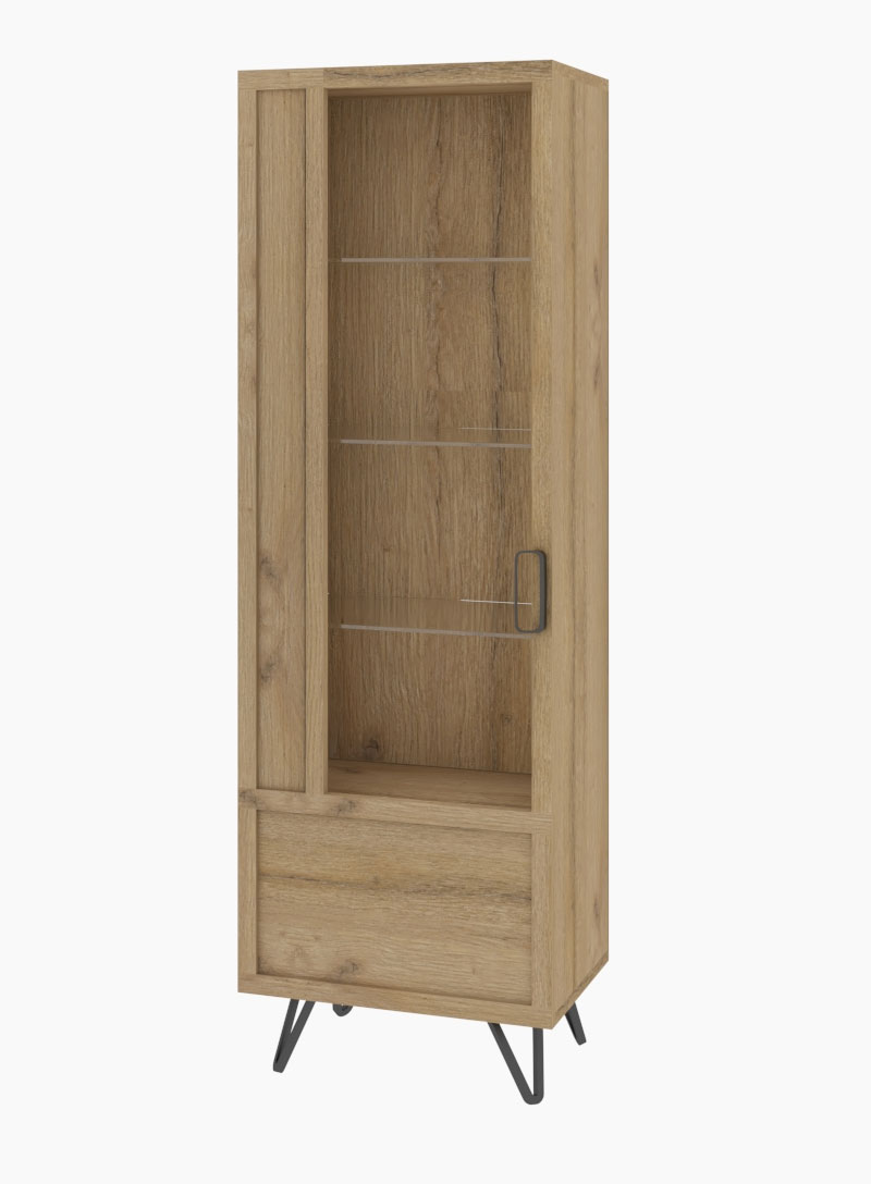 Sektor BIMBO je vytvorený pre náročnejších ľudí, ktorí si chcú kúpiť nadčasový nábytok. Kovové úchyty a nožičky dokonalo ladia s masívnymi dubovými čelami, ktoré dodávajú nábytku elaganciu. Korpus je vyrobený z kvalitnej LTD dosky. Bimbo sa skvelo hodí do miestnosti v akomkoľvek štýle a umožní Vám vytvoriť jedinečnú atmosféru v každom interiéri.Vitrína BIMBO 10 má jedny dvierka za ktorými sú 4 police, z toho tri sú sklenené. Materiál : masív, LTD, kovové nožičky a úchyty Rozmery (ŠxVxH) : 65 x 200 x 42 cmFarebné prevedenie : dub dziki/ artisan olejNábytok je dodávaný v demonte.