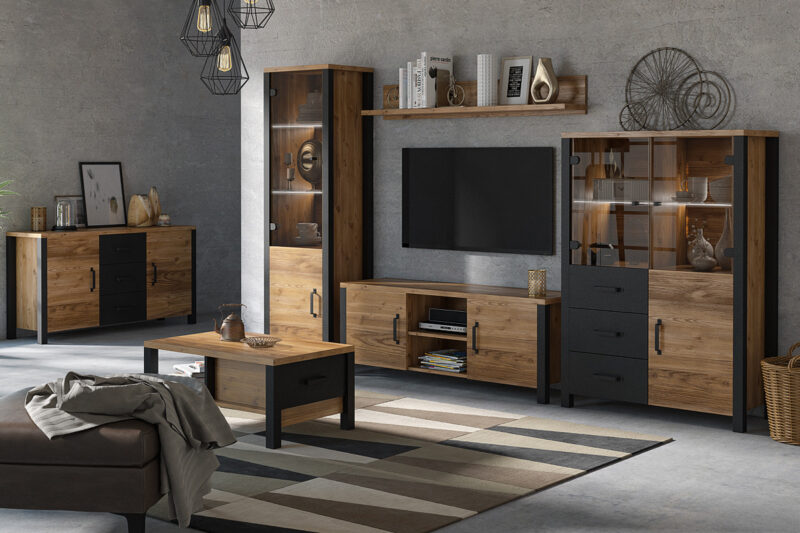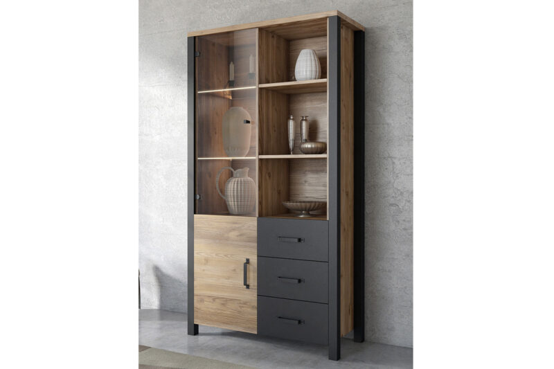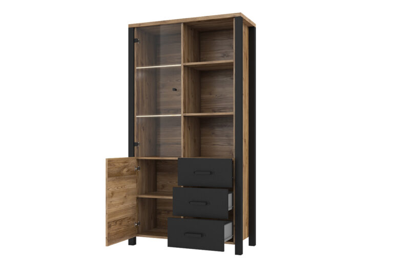 Obývací sektor VITTO to je kombinácia geometrických tvarov, zaujímavých detailov a farieb, ktoré Vám zabezpečia jedinečnú atmosféru industriálneho štýlu. Stavte na rozmanitú kolekciu nábytku a vytvorte si jedinečný interiér.Súčasťou sektoru VITTO je kombinovaná vysoká vitrína 13. Vitrína má vrchnú časť presklennú, čo môžete využiť na uloženie pohárov a iných spomienkových predmetov. Pravá časť je doplnená o úložné police, čo Vám istotne poslúži na uloženie zbierky kníh. Dolná časť má otváravé dvierka s policou a tri zásuvné šuplíky. Vitrína je vyrobená z veľmi kvalitného LTD materiálu.Vitrínu ponúkame v zaujímavom farebnom prevedení smrek appenzeller/čierny mat. Má elegantné úchytky čiernej farby.K vitríne doporučujeme dokúpiť osvetlenie, viď doporučenia.Rozmery:- šírka: 101 cm,- výška: 191 cm,- hĺbka: 43 cm.Dodávame v demonte, pričom montáž je veľmi jednoduchá.