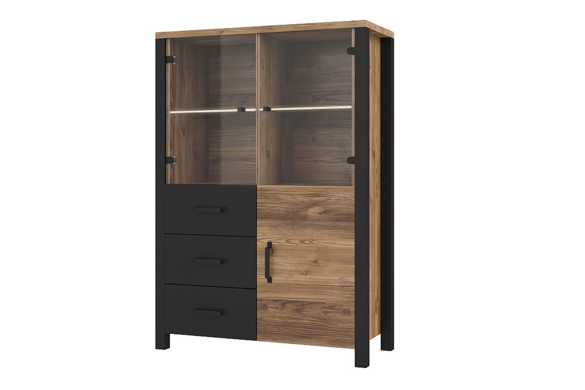 Obývací sektor VITTO to je kombinácia geometrických tvarov, zaujímavých detailov a farieb, ktoré Vám zabezpečia jedinečnú atmosféru industriálneho štýlu. Stavte na rozmanitú kolekciu nábytku a vytvorte si jedinečný interiér.Súčasťou sektoru VITTO je moderná kombinovaná vitrína 44. Vitrína má vrchnú časť presklennú, čo môžete využiť na uloženie pohárov a iných spomienkových predmetov. V dolnej časti sú po ľavej strane tri šuplíky a po pravej strane otváravé dvierka s úložnou policou. Vitrína je vyrobená z veľmi kvalitného LTD materiálu.Vitrínu ponúkame v zaujímavom farebnom prevedení smrek appenzeller/čierny mat. Má elegantné úchytky čiernej farby.K vitríne doporučujeme dokúpiť osvetlenie, viď doporučenia.Rozmery:- šírka: 101 cm,- výška: 146 cm,- hĺbka: 43 cm.Dodávame v demonte, pričom montáž je veľmi jednoduchá.