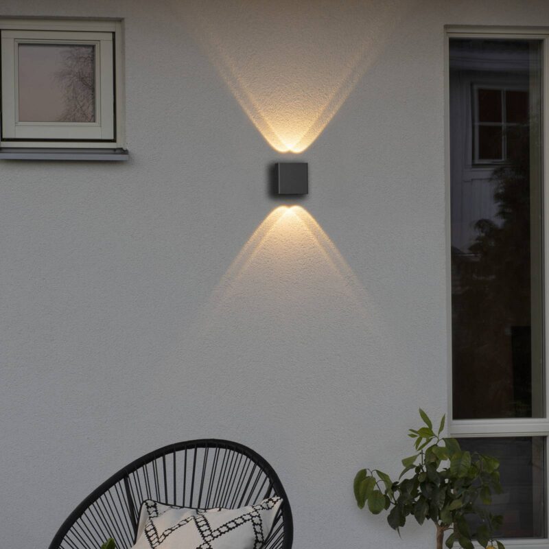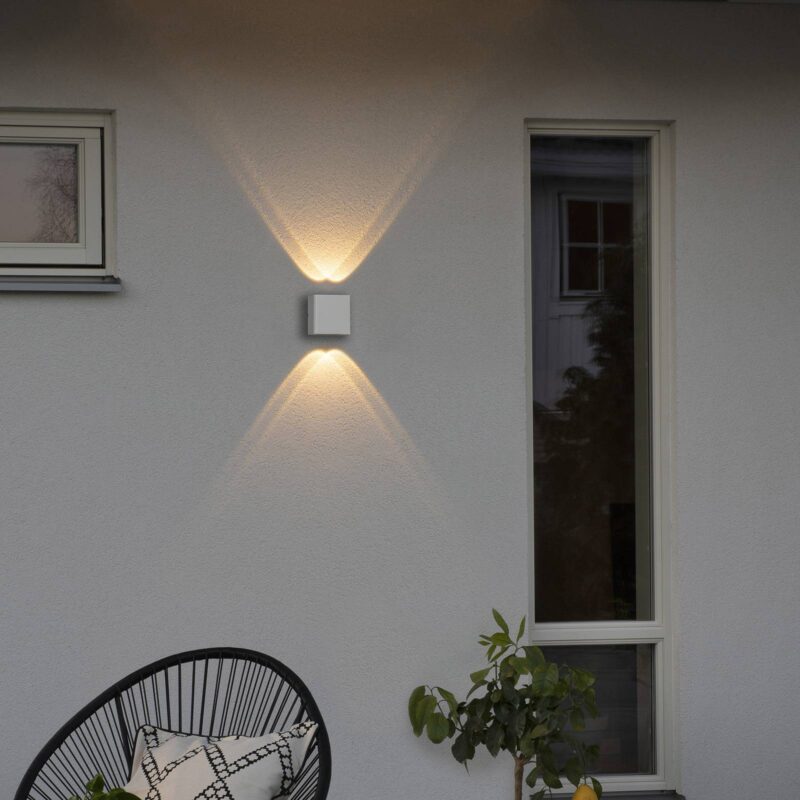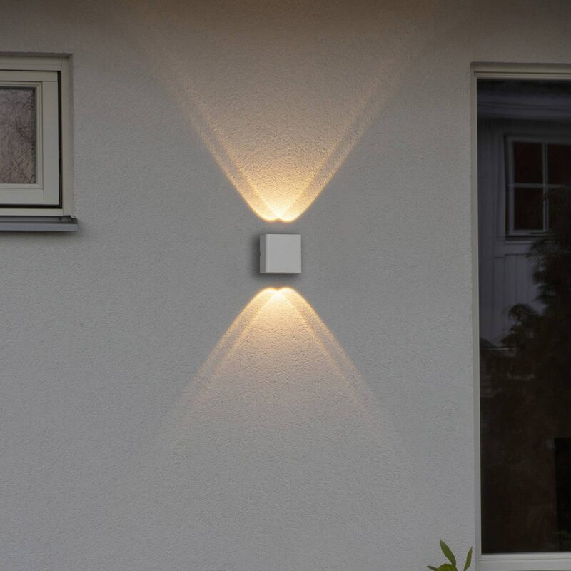 Obdĺžnikové nástenné LED svetlo Chieri s dvoma LED hore a dole Nástenná lampa Chieri je navrhnutá ako jednoduchý, plochý kváder vyrobený z hliníka s monochromatickým práškovým nástrekom. Pozornosť sa jednoznačne zameriava na svetelný efekt: v úzkej hornej a dolnej časti sú integrované dva samostatné svetelné zdroje LED, každý v konvexnej sklenenej šošovke. Tak vzniknú ostro definované svetelné kužele, ktoré sa prekrývajú so susednými svetelnými zdrojmi a vytvárajú na fasáde atraktívny efekt hore a dole.