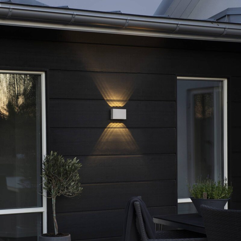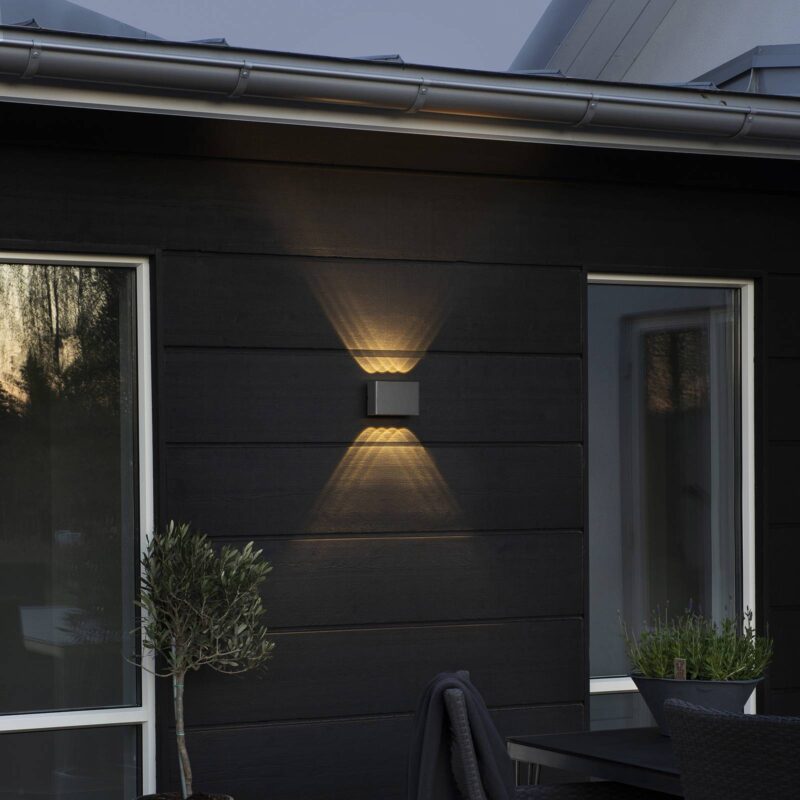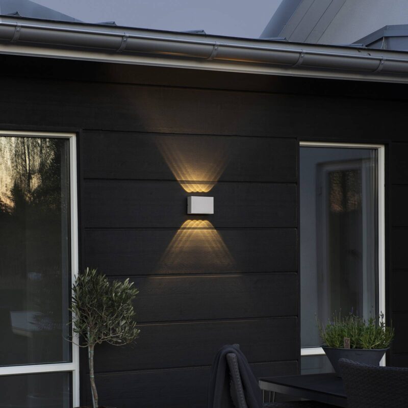 Osem žiarovkové LED vonkajšie nástenné svetlo Chieri – moderný svetelný zdroj so zaujímavým efektom V spoločnosti Chieri sa pozornosť zameriava na špeciálny svetelný znak. Vonkajšie nástenné svetlo má na vrchnej a spodnej časti štyri osvetľovacie body, ktoré sú umiestnené v samostatných vypuklých šošovkách. Vďaka tomu je svetlo emitované vo forme ostro ohraničených kužeľov. Svetelné kužele susedných LED sa prekrývajú, takže z geometricky vyzerajúcich, inak svetlých častí fasády, vzniká atraktívny efekt hore a dole. Konštrukcia ako plochý kváder z monochromatického práškovo lakovaného hliníka umožňuje harmonickú kombináciu s akýmkoľvek moderným dizajnom nehnuteľnosti.