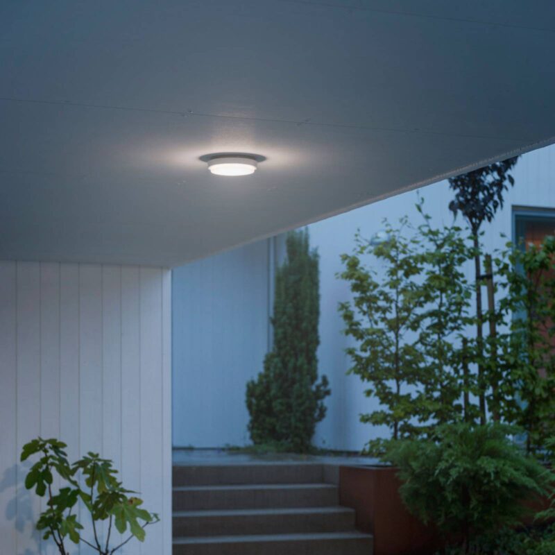 Jasne svietiace LED vonkajšie nástenné svetlo Cesena – je možné namontovať aj na strop LED vonkajšie nástenné svietidlo Cesena sa skladá z veľkého okrúhleho polykarbonátového tienidla a hliníkového nástenného držiaka. Je vybavený energeticky úspornými LED diódami a poskytuje všestranné atmosférické osvetlenie okolia. Cesena je vhodná napríklad na osvetlenie vstupného priestoru, ale je možné ju použiť aj ako stropné svetlo v krytých vonkajších priestoroch, napríklad v prístrešku pre auto alebo v oblasti zastrešenej terasy.