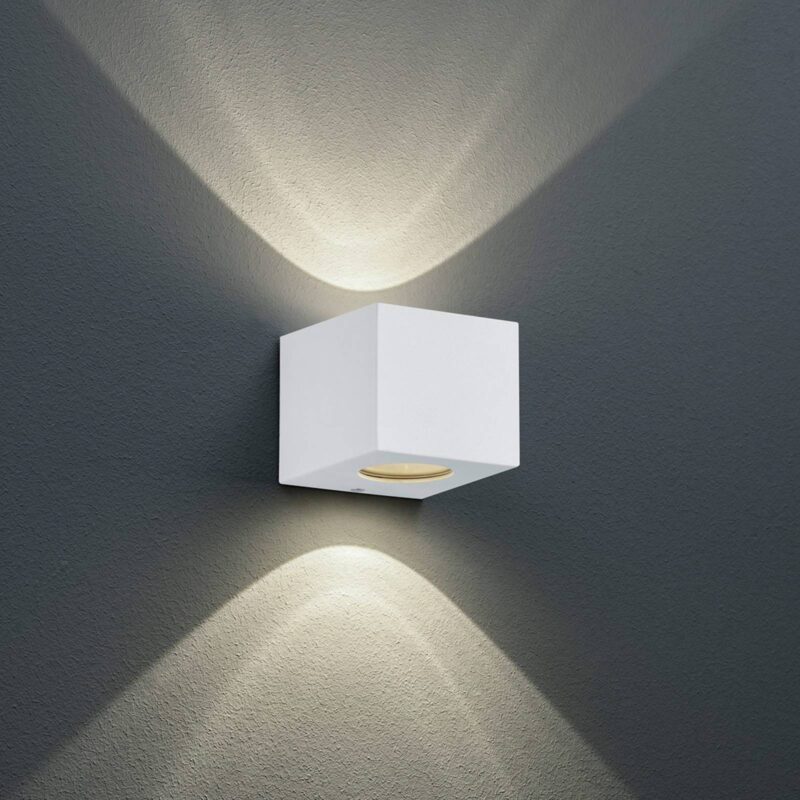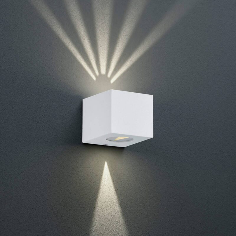 Vonkajšie nástenné svietidlo LED Cordoba so svetlom nahor a nadolVonkajšie nástenné svietidlo Cordoba v tvare kocky sa dokonale hodí do moderných vonkajších priestorov. Kryt je vyrobený z plastu s matným povrchom. Svetlo LED diód vyžaruje nahor a nadol cez dva otvory. Vďaka priloženým krytom s rôzne tvarovanými difúzormi možno vytvárať zaujímavé svetelné vzory alebo svietidlo Cordoba premeniť na čisto vzostupné alebo zostupné svetlo.