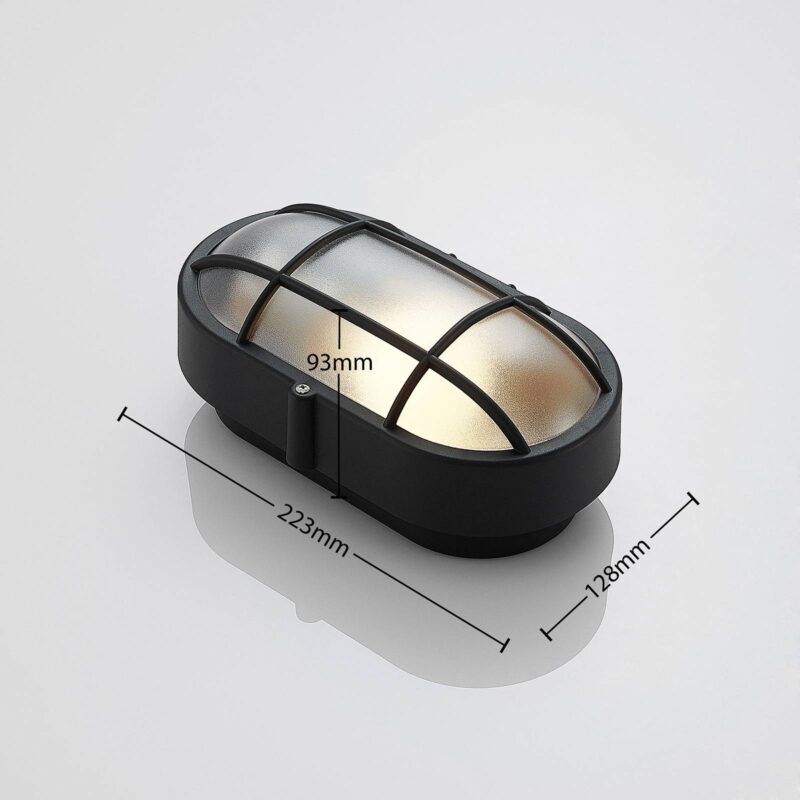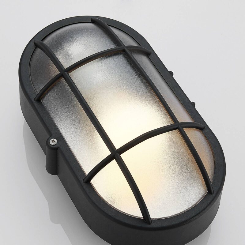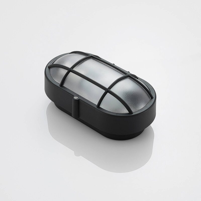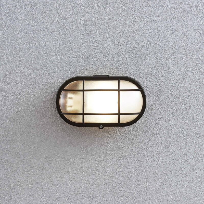Elipsovito tvarované vonkajšie nástenné svietidlo Alisha s čiernym povrchom a mriežkou, odolné voči morskej vode Svietidlo Alisha má plastové telo, ktoré sa vyznačuje odolnosťou voči morskej vode a vysokým stupňom odolnosti voči nárazu (IK06), čo poukazuje na veľmi dobrú pevnosť tohto vonkajšieho zdroja osvetlenia. Teleso lampy má nadčasovú čiernu farbu a navyše disponuje vloženou mriežkou zaisťujúcou bezpečné osadenie tienidla. Vďaka matnej úprave tienidla je distribúcia svetla rovnomernejšia. Svietidlo je koncipované na prevádzku so žiarovkou typu E27, pričom môžete siahnuť po modernom svetelnom zdroji s technológiou LED. Praktický všestranný kúsok do exteriéru!