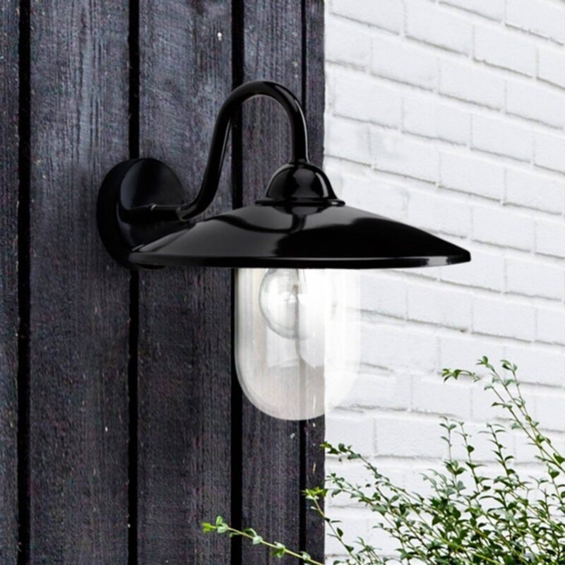 Očarujúce čierne vonkajšie nástenné svietidlo BRIG pre dom a záhradu Klasické čierne vonkajšie nástenné svietidlo BRIG osvetľuje vstupy do domu alebo terasy z diaľky. Zakrivený kovový rám je vyhotovený v lesklej čiernej farbe, zatiaľ čo číre sklenené tienidlo umožňuje svetlu jasne svietiť bez prekážok. Vhodné pre bežné žiarovky, úsporné alebo LED žiarovky.