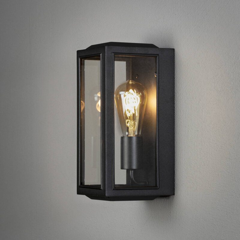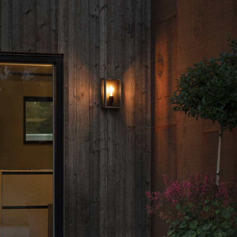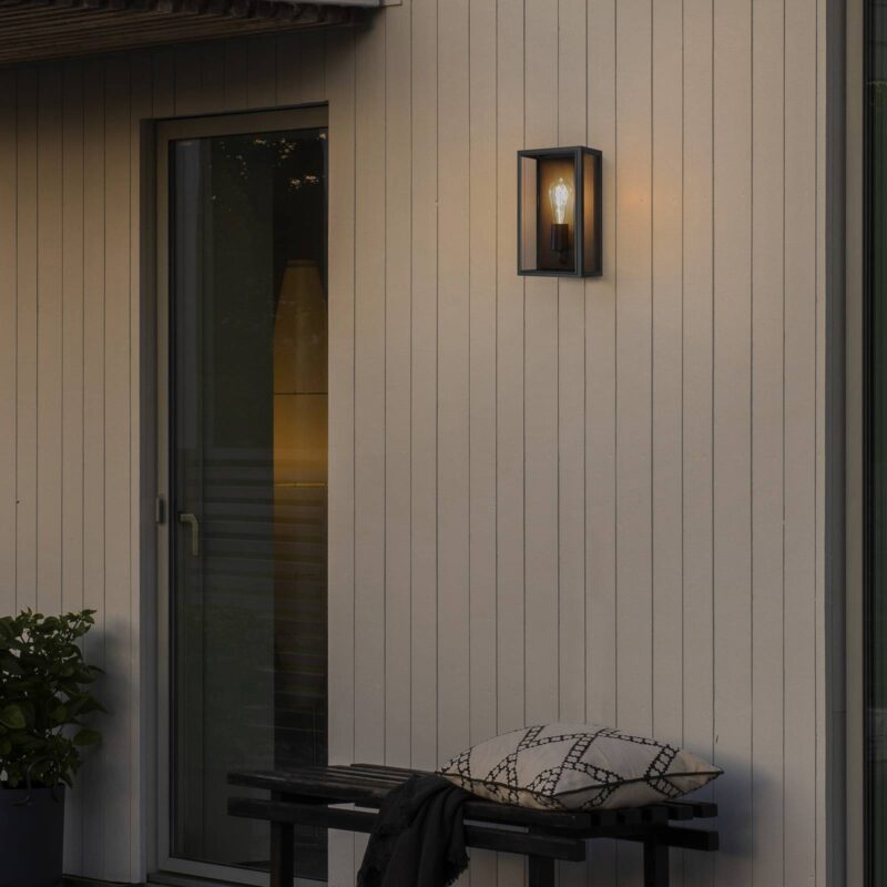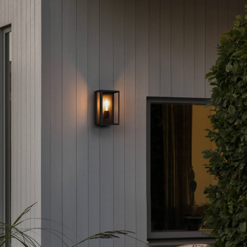 Kvádrové vonkajšie nástenné svietidlo Carpi s čírymi sklenenými povrchmi Toto vonkajšie nástenné svietidlo ponúka dokonalý Basis na obohatenie moderného vonkajšieho priestoru o dekoratívny svetelný prízvuk. Carpi je navrhnutý ako otvorený čierny kváder. Uzavretá zadná časť a vzpery vpredu sú vyrobené z hliníka a majú čierny práškový lak. Povrchy sú pokryté tabuľami z číreho skla, ktoré umožňujú výhľad na zdroj svetla, ktorý je použitý v objímke, nahor. Vizuálne harmonické žiarovky sú k dispozícii z príslušenstva.