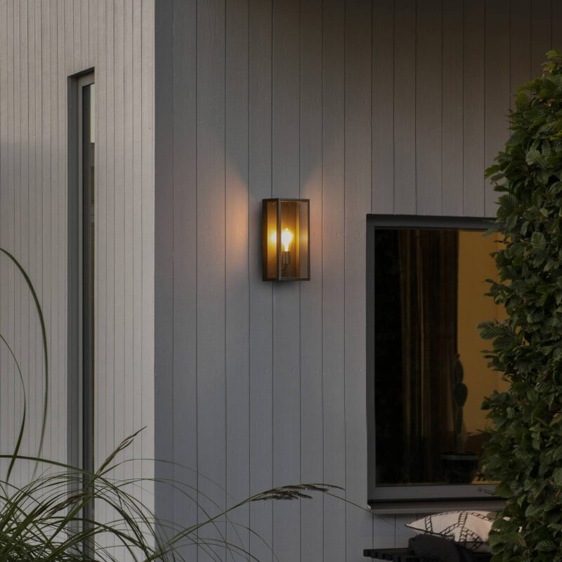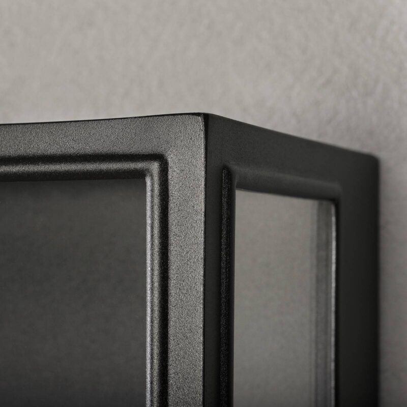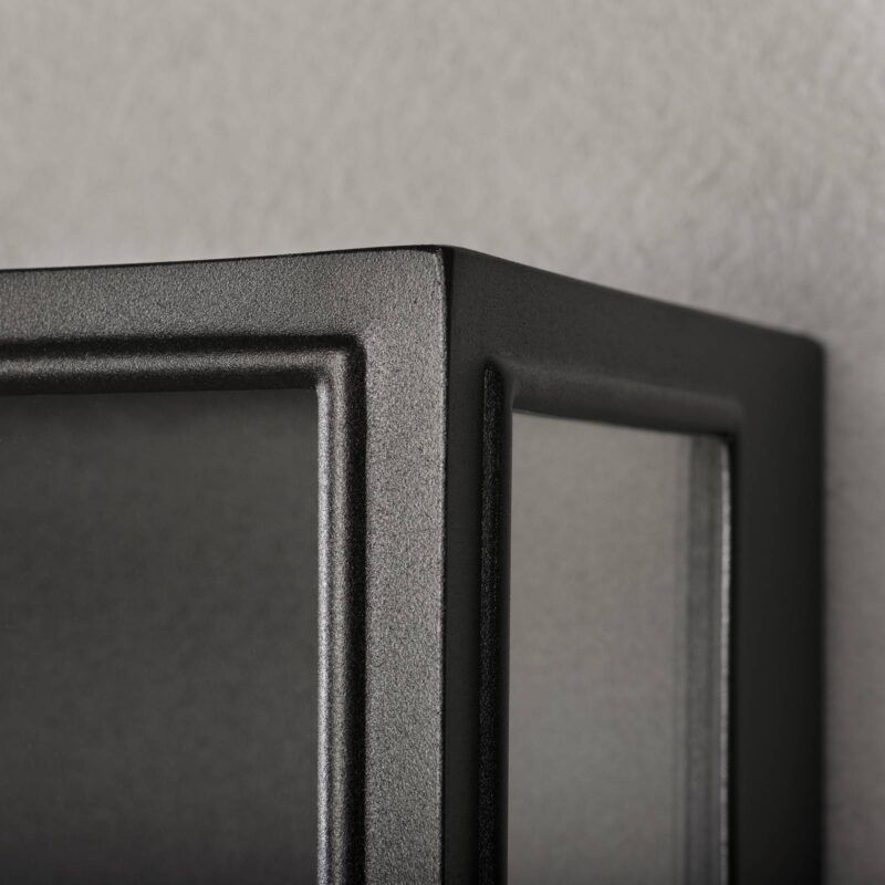 Kvádrové vonkajšie nástenné svietidlo Carpi s čírymi sklenenými povrchmi Toto vonkajšie nástenné svietidlo ponúka dokonalý Basis na obohatenie moderného vonkajšieho priestoru o dekoratívny svetelný prízvuk. Carpi je navrhnutý ako otvorený čierny kváder. Uzavretá zadná časť a vzpery vpredu sú vyrobené z hliníka a majú čierny práškový lak. Povrchy sú pokryté tabuľami z číreho skla, ktoré umožňujú výhľad na zdroj svetla, ktorý je použitý v objímke, nahor. Vizuálne harmonické žiarovky sú k dispozícii z príslušenstva.