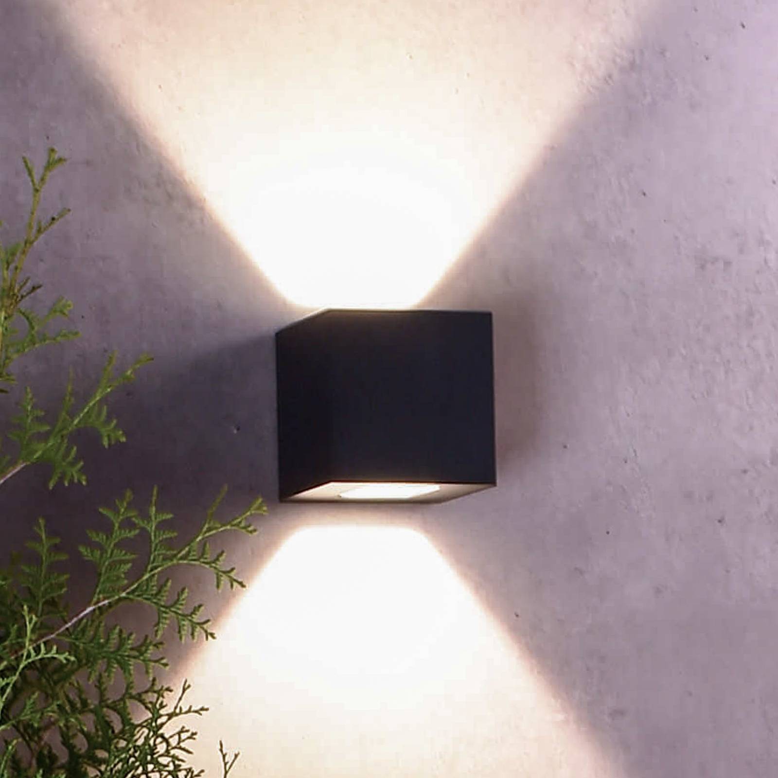 Vonkajšie nástenné svietidlo LED Jabbah v tvare kocky s horným a dolným rozvodom svetla Vďaka svojmu nenápadnému dizajnu tmavosivej kocky sa nástenné svietidlo Jabbah z tlakovo liateho hliníka dá integrovať do takmer každého prostredia. Jeho LED diódy vyžarujú teplé biele svetlo, ktoré je obmedzené uhlom 75° pomocou vývodov. To vytvára ostro definované akcenty smerom hore a dole. Vďaka vysokému výkonu vonkajšie nástenné svietidlo účinne uľahčuje aj orientáciu v okolitom vonkajšom priestore – Svetelný výkon možno pred uvedením do prevádzky znížiť na 60 % pomocou prepínača DIP – Stupeň ochrany: IP65 – Teplota okolia počas prevádzky: – 20 °C až + 40 °C