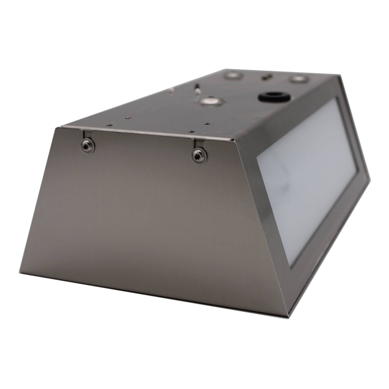 Vonkajšie nástenné svietidlo Long z jemne kefovaného nehrdzavejúceho ocele s pohybovým senzorom Toto vonkajšie nástenné svietidlo z nehrdzavejúceho ocele je vďaka svojmu jednoduchému obdĺžnikovému tvaru univerzálnym spoločníkom pre optimálne osvetlenie vonkajších priestorov. Funkčné telo je vybavené bočnými a prednými opálovými sklenenými platňami, ktoré rozptyľujú svetlo príjemným spôsobom a neoslňujú. Vysokokvalitné materiály a ich kvalifikované a starostlivé spracovanie charakterizujú vonkajšie svietidlá tohto výrobcu vyrobené v Nemecku, ktoré sú všetky vybavené najmodernejšou technikou. Technické údaje snímač pohybu: – Spínací výkon: max. 120 W – Montáž: 230 V / 50 Hz – Uhol snímania: cca 150° – Nastavenie času: 10 sek. – 8 min. – Nastavenie súmraku: 10 – 2000 luxov – Dosah: max. 8 m