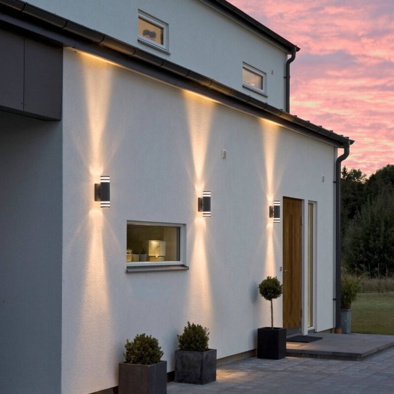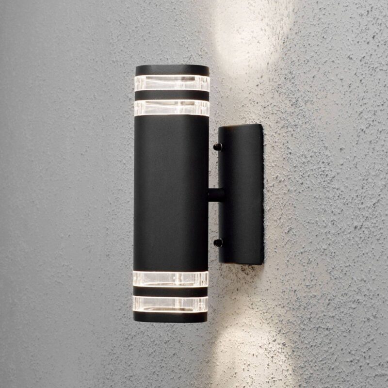 Dvojplameňové vonkajšie nástenné svietidlo Modena s priamym a nepriamym vyžarovaním svetla Nástenné svietidlo Modena vyrobené z matného čierneho lakovaného hliníka s integrovanými, priehľadnými akrylovými prvkami zdobí steny mnohých moderných budov. Vďaka svojej nadčasovej elegancii je univerzálnym zdrojom svetla. Používa sa jednotlivo alebo v skupine – Modena ponúka vynikajúce osvetlenie okolia pomocou dekoratívnych svetelných akcentov. Nástenné svietidlo vyžarujúce príjemné svetlo, ktoré prispieva k plusu v bezpečnosti a pocite pohody.