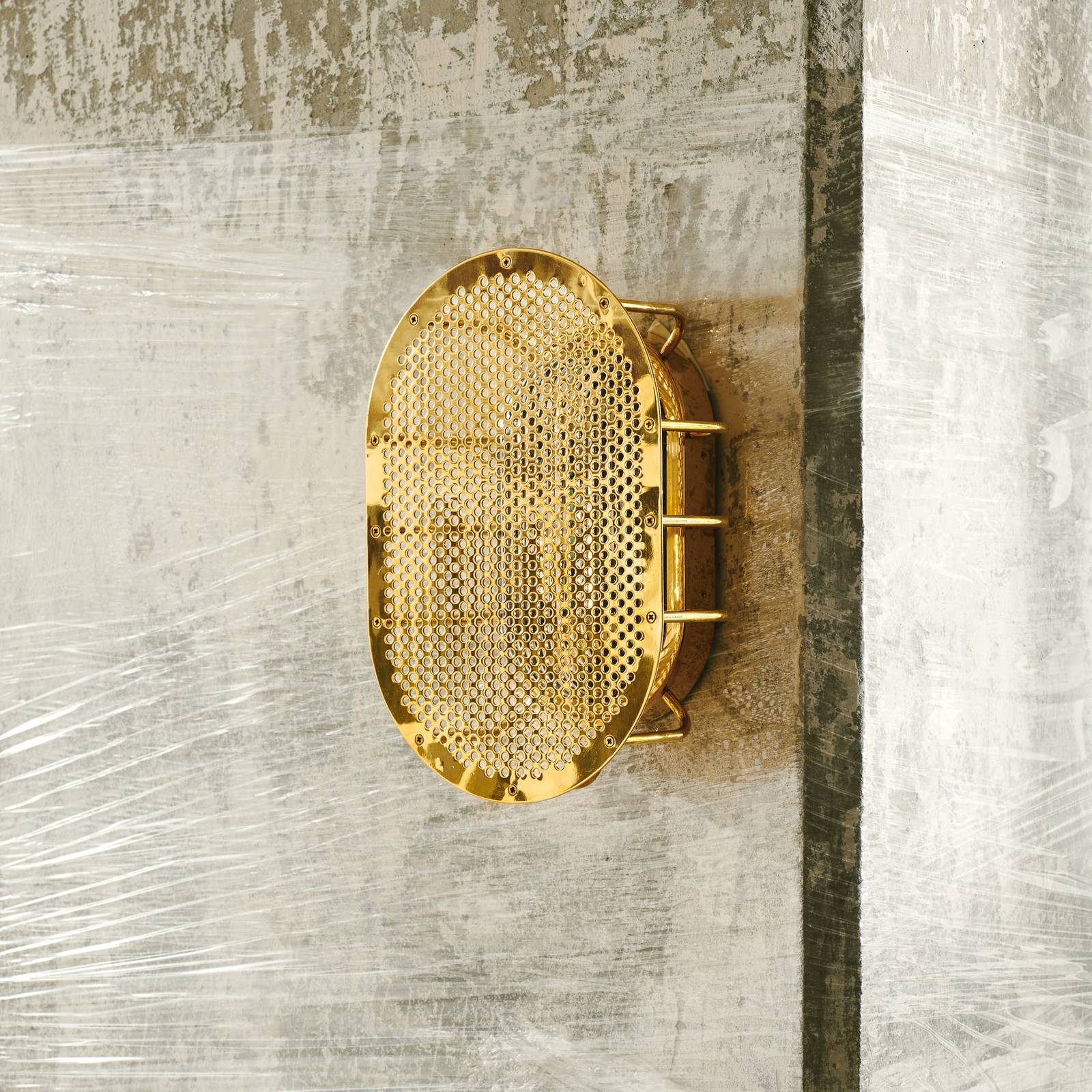 Vonkajšie nástenné svietidlo Night Rider z mosadze, IP54 Vonkajšie nástenné svietidlo Night Rider je interpretáciou klasického svietidla Bulkhead pre vonkajšie priestory od DESIGN BY US. Zabezpečuje štýlový vzhľad na terase, na fasáde domu, ako aj vo vnútri v kuchyni alebo v kúpeľni. Toto dizajnové svietidlo je chránené proti striekajúcej vode a môže byť namontované horizontálne aj vertikálne. Za prednou časťou s mriežkovou štruktúrou z mosadze sa nachádza sklenený kryt, ktorý chráni použitú žiarovku R7s (nie je súčasťou balenia, pozri príslušenstvo). Aj keď je vypnuté, toto elegantné vonkajšie nástenné svietidlo priťahuje všetky pohľady.