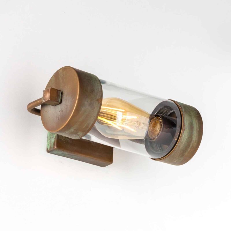 Starožitné dizajnové nástenné svietidlo Silindar 3389 do exteriéru – povrchová úprava odolná voči morskej vode Toto nástenné svietidlo v sebe spája mnoho výhod: Silindar je odolný voči striekajúcej vode, a preto je vhodný na vonkajšie použitie, jeho rám je vyrobený z robustnej mosadze, ktorá bola ručne starožitne upravená, a sklo svietidla v peknom valcovitom tvare zabezpečuje príjemné vyžarovanie svetla po celom obvode. Svietidlo Silindar je tiež chránené proti korózii, takže je vhodné na inštaláciu na domoch v blízkosti mora. Či už je umiestnené samostatne na rohu domu alebo napríklad naľavo a napravo od vchodových dverí, vonkajšie nástenné svietidlo Silindar všade upúta pozornosť a dodá celkovému vzhľadu budovy starožitný nádych.