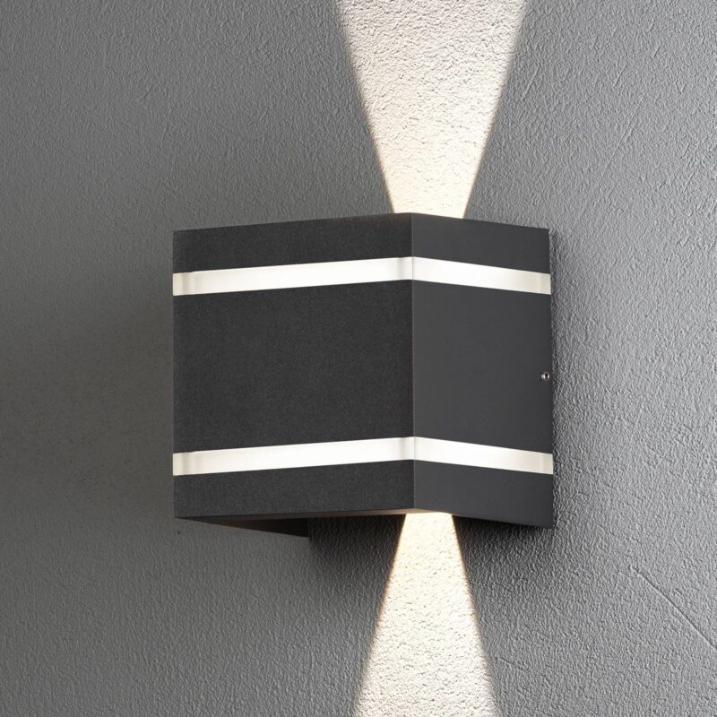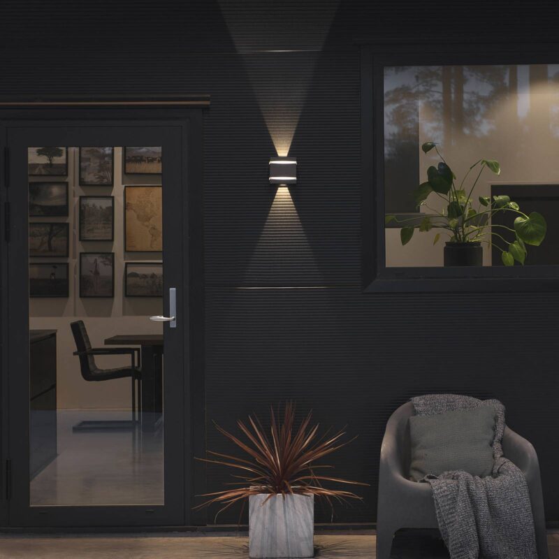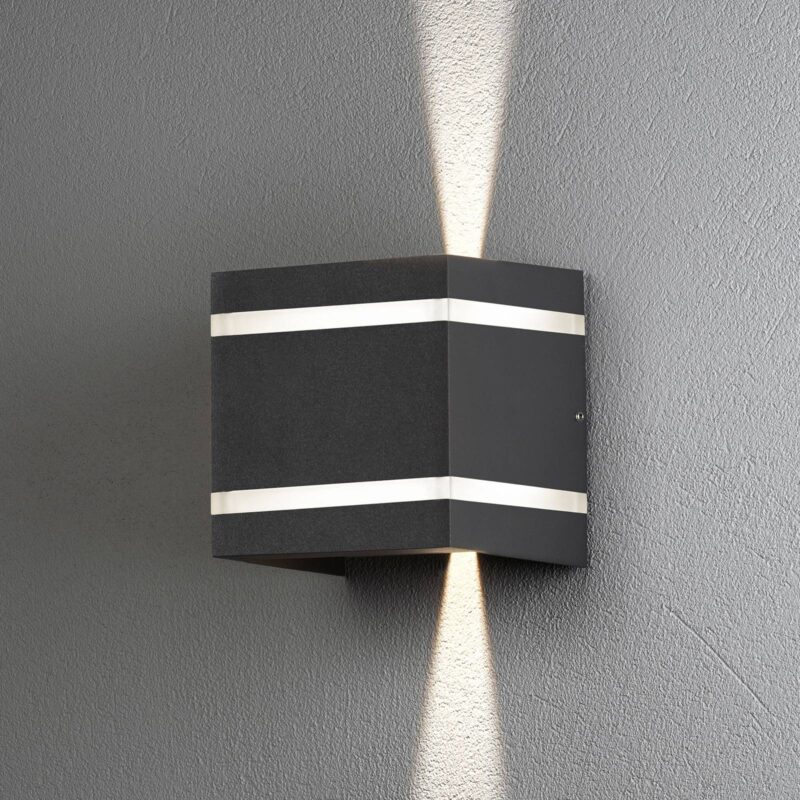 LED vonkajšie nástenné svetlo Cremona s nastaviteľným uhlom lúča, hore / dole Robustné exteriérové nástenné LED svetlo Cremona je ideálne na elegantné osvetlenie moderných fasád domu. Skladá sa z puzdra z lakovaného hliníka a dvoch elegantných pruhov z akrylu. Vďaka nim žiarovka Cremona vyzerá elegantne aj za denného svetla a v noci pomáhajú vytvárať fascinujúci svetelný efekt. Jasné svetlo z dvoch zabudovaných LED diód svieti nielen cez malé pásiky, ale svieti aj nahor a nadol. Uhol vyžarovania dvoch vývodov je možné meniť jednotlivo od 0 ° do 90 °, a teda navrhovať od úzkeho po široký.
