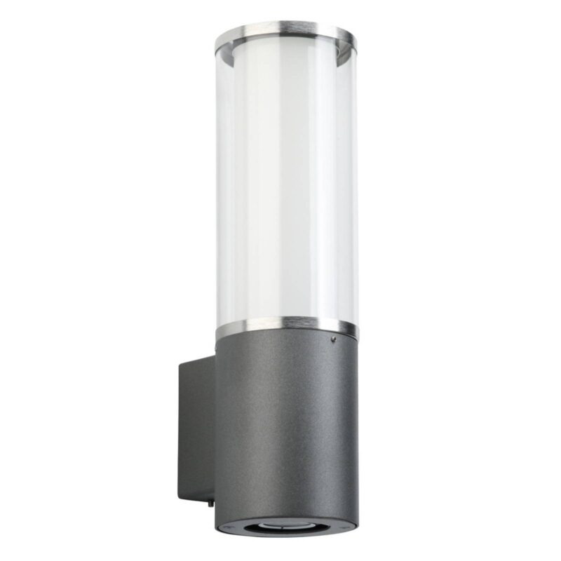 Moderné vonkajšie nástenné svietidlo Elettra antracitovej farby a v tvare valca – 38,5 cm Vďaka svojmu modernému tvaru valca je vonkajšie nástenné svietidlo Elettra príťažlivé pre každú fasádu domu. Hliníkový podstavec je antracitovej farby. Teleso svietidla pozostáva z priehľadného akrylového skla a je vybavené strieborným kovovým okrajom. Vo vnútri akrylového skleneného rámu sa nachádza difuzér z opálového skla. V ňom vzniká priateľské, neoslňujúce svetlo. Vonkajšie nástenné svietidlo odoláva vďaka ochrannej triede IP44 vonkajším vplyvom vlhkosti. Svietidlo Elettra je prakticky vhodné ako pekný pútavý prvok na fasádu alebo vstupný priestor. Vonkajšie nástenné svietidlo je vysokokvalitný výrobok z Nemecka. Výrobca sa môže obzrieť za 60 rokmi skúseností v konštrukcii svietidiel. Prvotriedny výber materiálu a robustnosť charakterizujú výrobné charakteristiky.