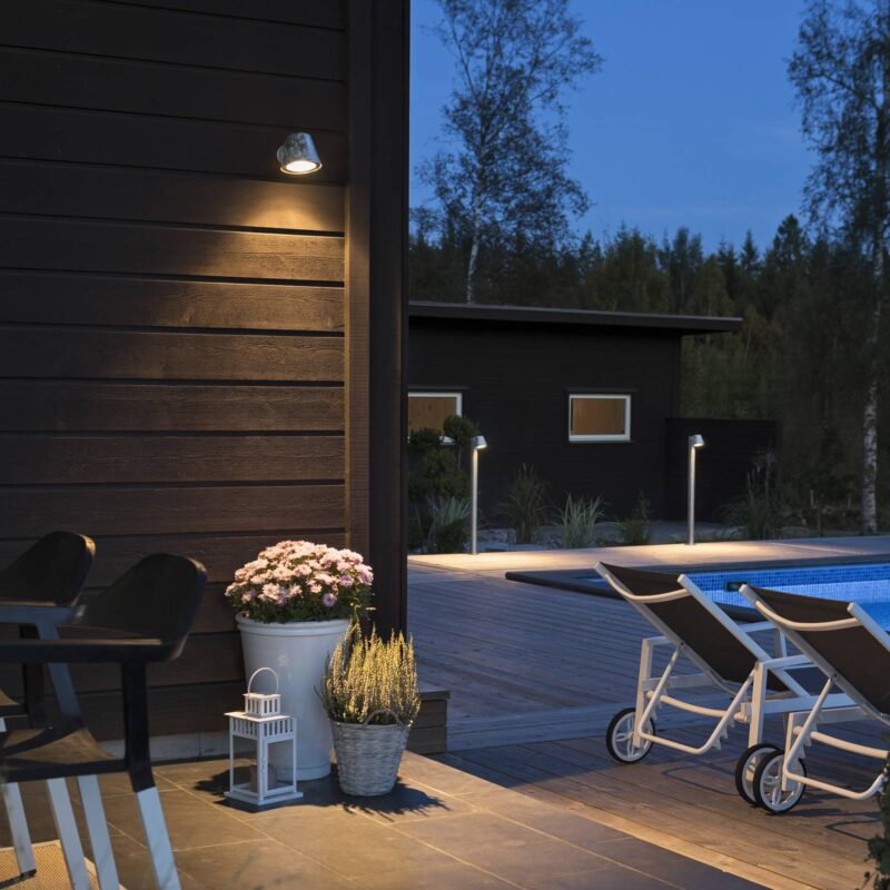Atraktívne a odolné – vonkajšie nástenné svetlo Terst Vďaka pozinkovanej oceli môže vonkajšie nástenné svietidlo Trieste využívať stabilný rám, ktorý akrylový kryt dokáže robustne podoprieť. Vo vnútri sú inštalované halogénové žiarovky, ktoré poskytujú teplé a príjemné svetlo a predovšetkým vytvárajú efekt osvetlenia v kombinácii s inými svetlami. To znamená, že napríklad domové dvere môžu byť komplexne osvetlené.
