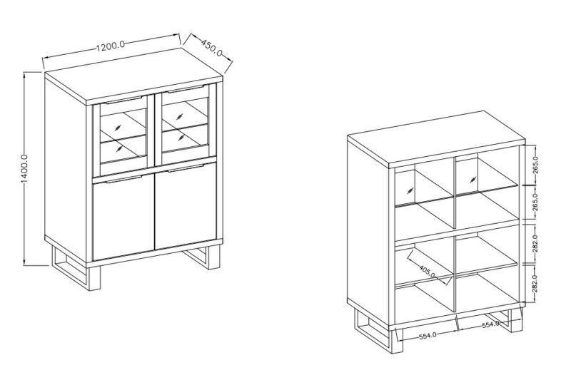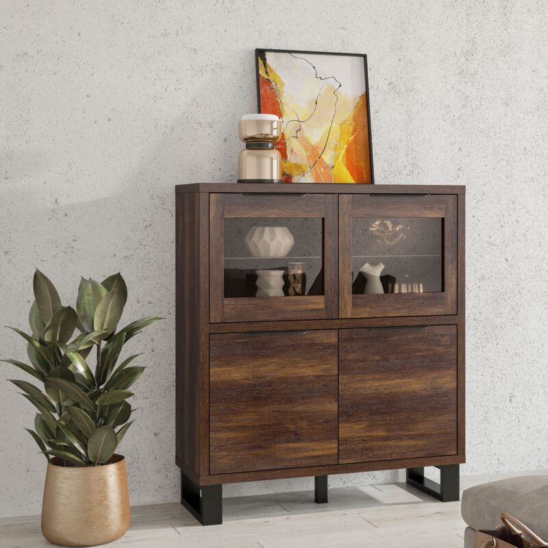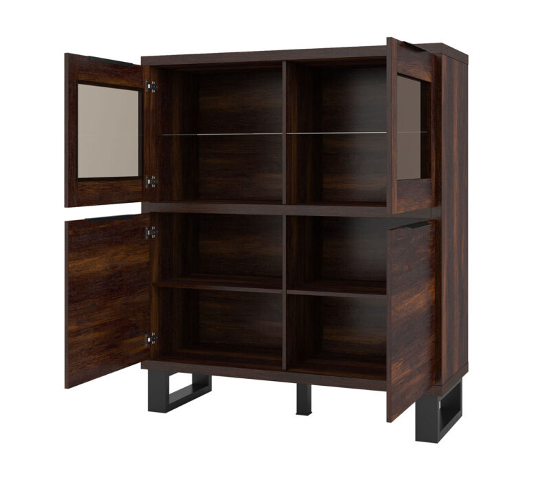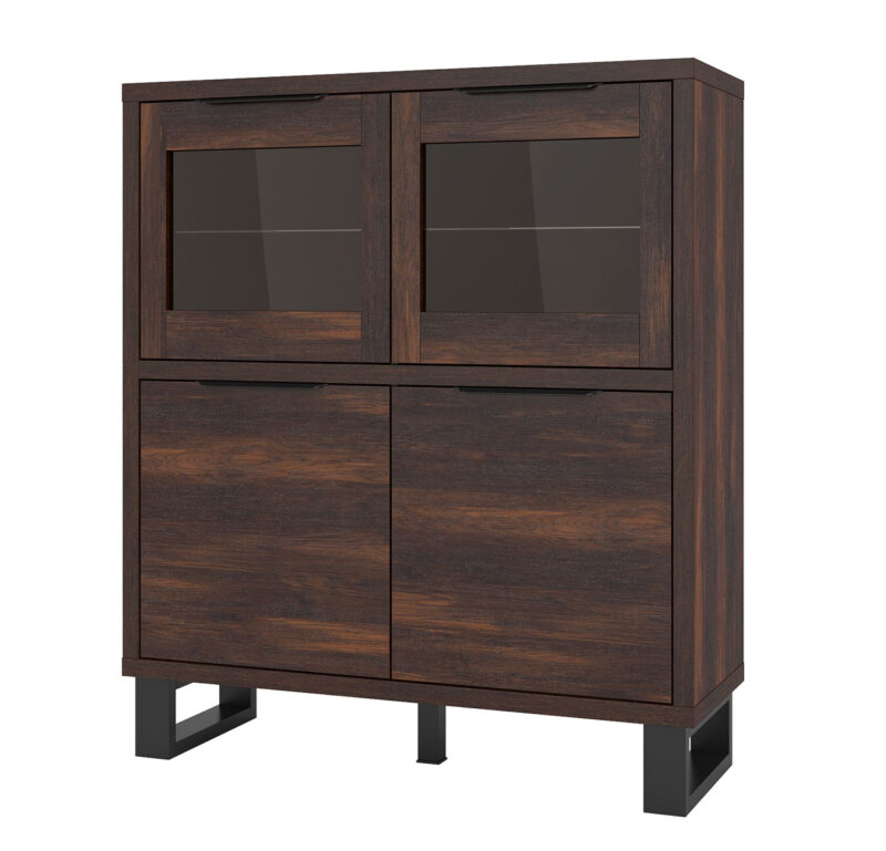 Sektor HELL svojím netradičným a zároveň elegantným dizajnom presvetlí každý moderný interiér.Vysoká komoda HELL 42 má 4 dvierka, z ktorých horné dve sú doplnené o sklenenú výplň. Komoda Vám tak poslúži ako knihovnička, prípadne na odloženie pohárov a váz. Dolné dve dvierka komody schovajú Vaše rôzne dokumenty prípadne predmety.Komoda je vyrobená z kvalitnej LTD dosiek, ktorá sa ľahko udržiava.Farba komody je dub wotan, po stranách s čiernými kovovými nohami. Má elegantné úchytky z plastu čiernej farby.Rozmery:- šírka: 120 cm,- výška: 140 cm,- hĺbka: 45 cm.Komodu dodávame v demonte a jej montáž je jednoduchá.