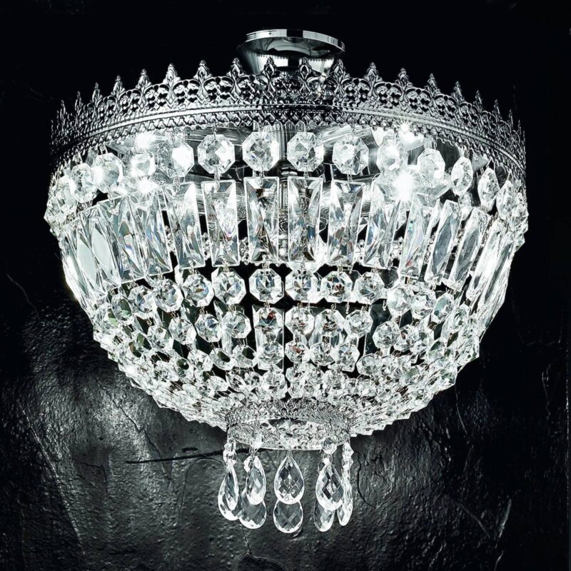 Nádherné stropné svietidlo Cupola s kryštálmi Nad stropným svietidlom je akási koruna. Tá ozdobne rámuje hornú časť svetla. Kov svetla má vzhľad niklu. Veľké množstvo sklenených kryštálov je navzájom prepojených do tvaru misky. Zložité zavesenie skla pôsobí oslnivo a efektne vďaka odrazom svetla. Lomené hry svetla sa v exkluzívnom svetle svietidla odrážajú na stenách a stropoch.