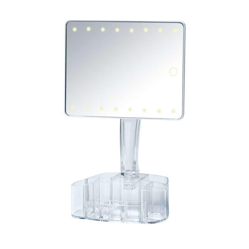 Toto kozmetické zrkadlo je doplnkom, ktorý nesmie chýbať na žiadnom toaletnom stolíku. Zrkadlo s LED osvetlením obsahuje 16 jasných svetelných diód, ktoré prirodzene nasvietia vašu pleť a umožnia naniesť kozmetické prípravky aj za šera.Pohodlné ovládanie jednoduchým dotykom – dotykový senzor, intenzita svetla je nastaviteľná. Priehľadný organizér s niekoľkými priehradkami umožní mať vašu obľúbenú kozmetiku, štetce na make-up alebo šperky vždy po ruke. Otočné na výšku aj na šírku. Zrkadlo je ľahké, ľahko prenosné. Napájanie na 4 batérie AAA, ktoré nie sú súčasťou balenia. Rozmer: 36 x 17 x 12,5 cm.