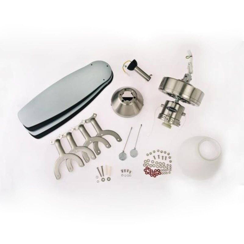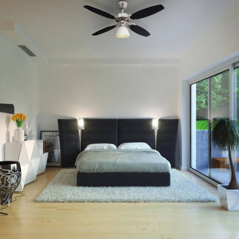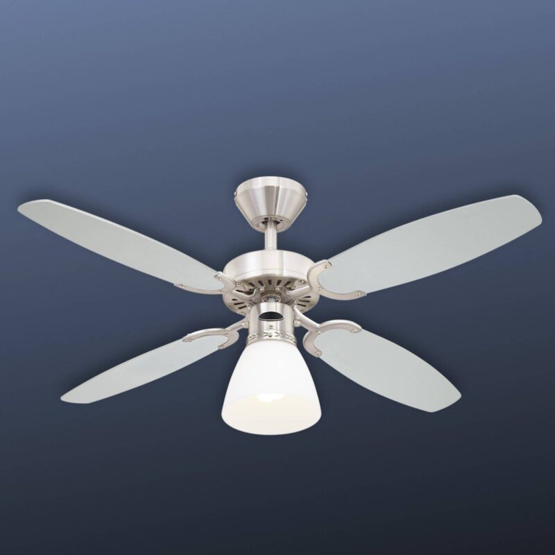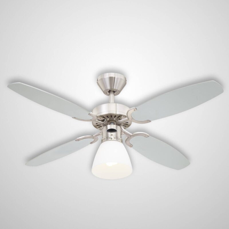 Osvetlený stropný ventilátor Capitol so štyrmi lopatkami v čiernej a striebornej farbe Štvorlopatkový ventilátor Capitol poteší moderným dizajnovým vzhľadom: kryt a motor sú vyrobené z brúsenej ocele, obojstranné lopatky z plastu sú z jednej strany čierne a z druhej strany strieborné. Možno ich vystaviť podľa vlastného vkusu a prispôsobiť štýlu interiéru. Poznámka: Súčasťou dodávky je prechodová tyč. Je absolútne nevyhnutný na montáž stropného ventilátora. Funkcie Ventilátor je možné prevádzkovať v troch výkonoch a pri troch rýchlostiach. Je možná letná aj zimná prevádzka. To znamená, že v letnom režime sa lopatky rotora pohybujú proti smeru hodinových ručičiek a cirkulujú vzduch tak, aby sa vzduch v miestnosti ochladil. Pravotočivá prevádzka v zime spôsobuje redistribúciu teplého vykurovacieho vzduchu, ktorý sa zhromažďuje v horných častiach pod stropom. Tým sa šetrí energia (približne 30 %) a znižujú sa náklady na vykurovanie. Capitol má ťahový spínač a môže byť dodatočne vybavený diaľkovým ovládaním alebo nástenným vypínačom. Tvarované sklenené svietidlo poskytuje príjemné ambientné osvetlenie. Technické údaje Výkon na otáčky: – 32 W pri 115 ot/min – 35 W pri 155 ot/min – 42 W pri 210 ot/min