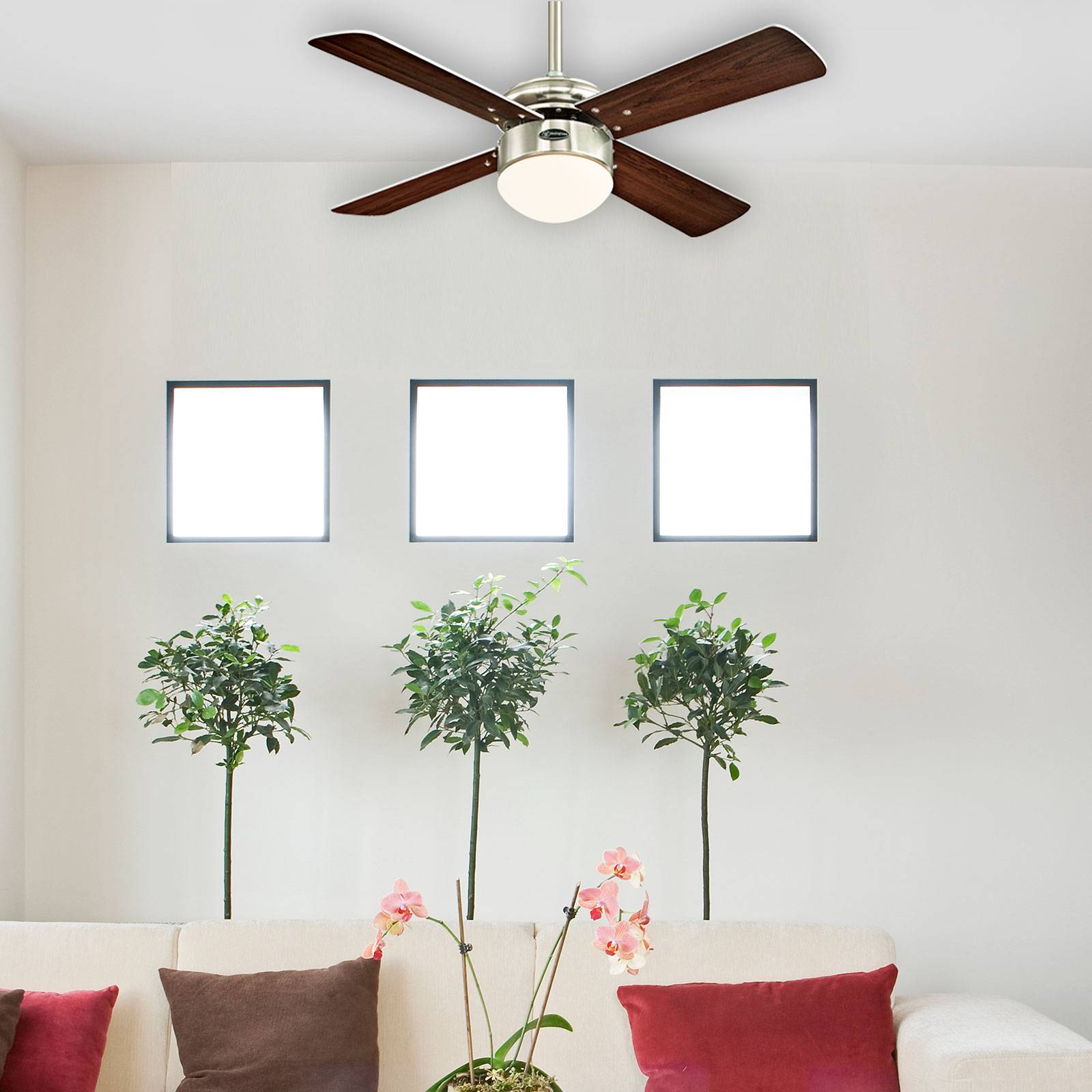 Moderný stropný ventilátor Colosseum s LED osvetlením Stropný ventilátor Colosseum s štyrmi otočnými lopatkami pôsobí nadčasovo elegantne a je vhodný do miestností s plochou až 15 metrov štvorcových. Lopatky sú vyhotovené v farbe starnutého javora a striebro, rám je z brúseného niklu. Súčasťou balenia je predlžovacia tyč. Funkcie Stropný ventilátor Colosseum s elegantným skleneným svietidlom nielen zlepšuje kvalitu vzduchu v miestnosti, ale je vhodný aj ako základné osvetlenie. Navrhnutý pre letnú a zimnú prevádzku s predbežným a spätným chodom: v lete ventilátor príjemne osviežuje vzduch v miestnosti, v zime sa vďaka zmiešavaniu stúpajúceho teplého vzduchu s chladnejším vzduchom v miestnosti dosahuje príjemná klíma, čo sa prejavuje aj znížením potreby kúrenia a z toho vyplývajúcich nákladov. Pomocou dodávaného diaľkového ovládania je možné pohodlne ovládať ventilátor a LED osvetlenie. Technické údaje Výkon: max. 40,7 W Rýchlosť: max. 256 ot/min