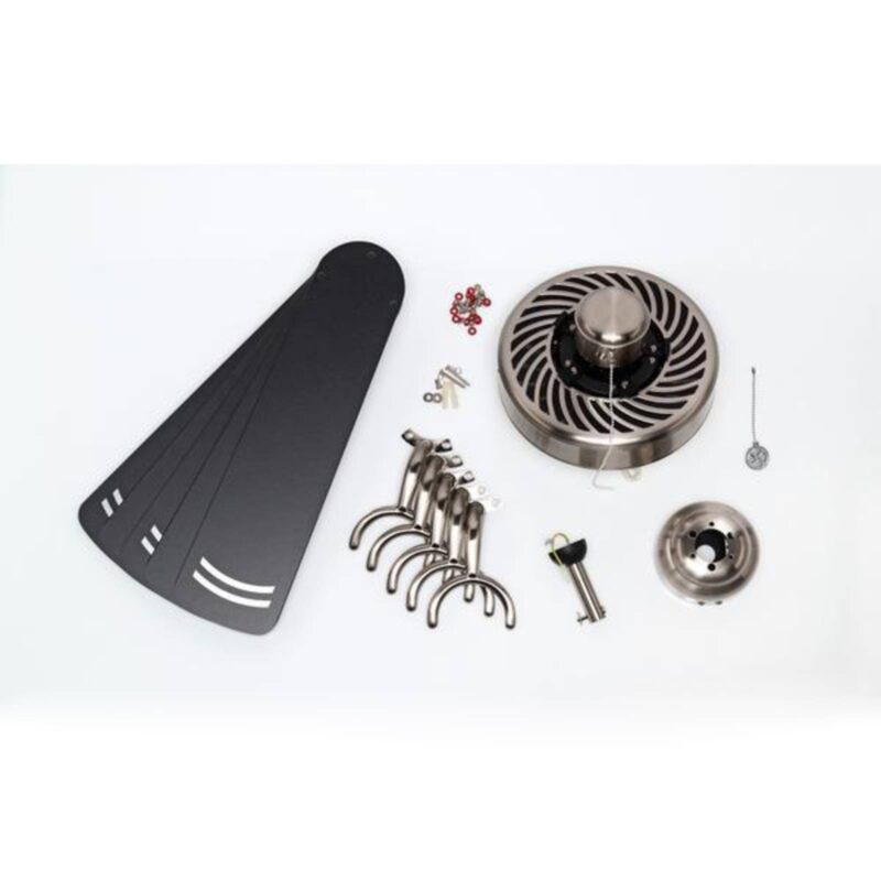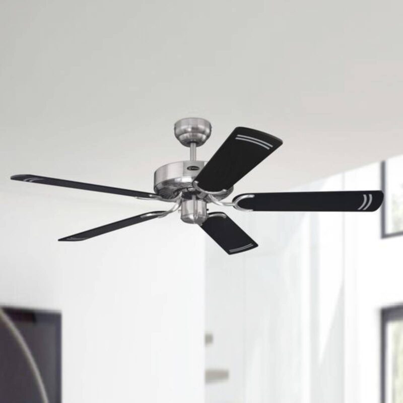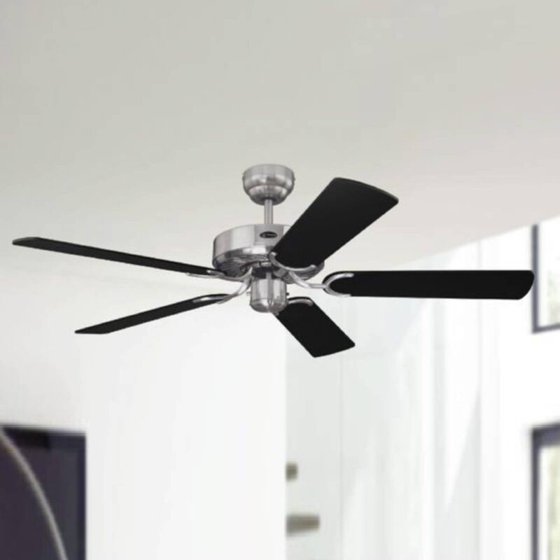 Tichý stropný ventilátor Cyclone – päť lopatiek Krásny stropný ventilátor Cyclone od spoločnosti Westinghouse poteší svojím kovovým krytom vo vzhľade brúsenej ocele. Päť obojstranných čepelí – jedna strana čierna, druhá čierno-strieborná – spolu dokonale ladí. Cyclone je vhodný pre miestnosti s obytnou plochou do 30 m². Pri stropoch vyšších ako 3,50 m je potrebné použiť predlžovaciu tyč (pozri príslušenstvo). Funkcie Ťahový spínač pre trojstupňovú prevádzku je možné dodatočne vybaviť nástenným spínačom alebo diaľkovým ovládaním (pozri časť príslušenstvo). Prepínanie na jazdu dopredu alebo dozadu je riešené pomocou posúvača. Prepnutím na letný režim s chodom dopredu sa dosiahne príjemné chladenie, v zimnom režime s chodom dozadu sa dosiahne komfortná cirkulácia tepla a maximálne 30 % úspora nákladov na vykurovanie. Technické údaje Príkon na rýchlosť: – 26 W pri 80 otáčkach za minútu – 40 W pri 130 otáčkach za minútu – 58 W pri 180 otáčkach za minútu Špeciálne vlastnosti Vybavený mimoriadne tichým motorom.