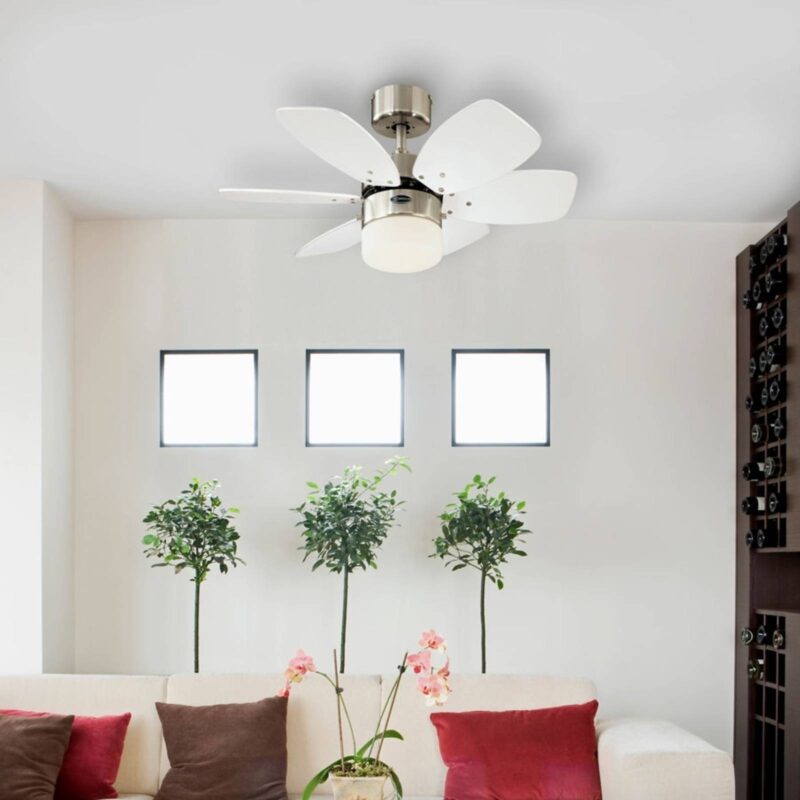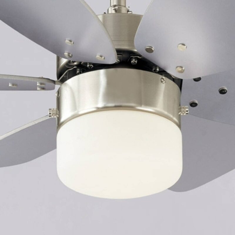 Kompaktný stropný ventilátor Floral Royal s funkciou posunu vpred a vzad Stropný ventilátor Floral Royal nesie svoje meno z určitého dôvodu. Súhra krátkych, silných čepelí a stručného zdroja svetla v strede skutočne vytvára dojem, že ide o kvet v chrómovom vzhľade. Osvetľovacie zariadenie nie je súčasťou dodávky. Od výšky stropu 350 cm je potrebný predlžovací stĺp – možno objednať prostredníctvom príslušenstva. Funkcie Vybavený na celoročné používanie, t. j. vybavený letnými a zimnými funkciami. V lete sa vzduch v miestnosti osvieži a v zime sa stropný ventilátor Floral Royal postará o príjemné teplotné podmienky a vítané zníženie nákladov na energiu vďaka distribúcii ohriateho vzduchu. Čepele sú dvojfarebné a možno ich ľubovoľne otáčať. Vybavené ťahovým spínačom. Technické údaje Výkon na otáčky: – 27 W pri 120 ot/min – 38 W pri 180 ot/min – 54 W pri 240 ot/min