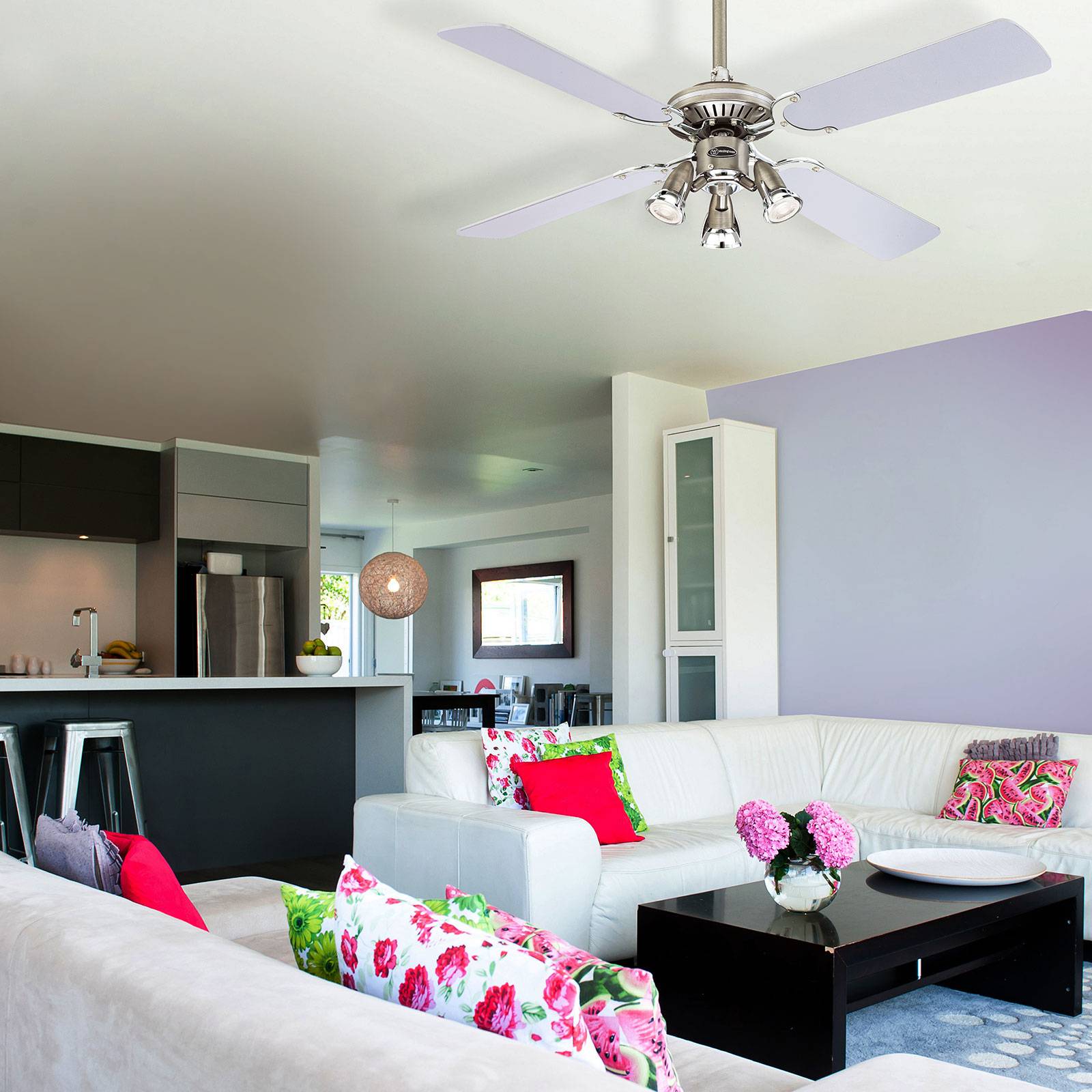 Stropný ventilátor Princess Euro s troj-plameňovým bodovým svetlom Štvor-plameňový stropný ventilátor Princess Euro s otočnými lopatkami v striebornej a grafitovej farbe pôsobí nadčasovo elegantne, je mimoriadne výkonný pri osviežovaní vzduchu a okrem toho je vybavený troj-plameňovým bodovým svetlom. Osvetlenie a ventilátor sú ovládané integrovaným šnúrovým vypínačom. Môže byť dodatočne vybavený nástenným spínačom alebo diaľkovým ovládaním. Vhodné výrobky je možné objednať samostatne ako príslušenstvo. Funkcie Stropný ventilátor Princess Euro sa môže namontovať so stropnou tyčou alebo bez nej v závislosti od výšky stropu. Stropná tyč je už zahrnutá v dodávke. Ventilátor sa môže prepnúť z letného na zimný režim pomocou posuvného ovládača na kryte. To znamená, že buď slúži ako osviežovač vzduchu, alebo pomáha šetriť energiu cirkuláciou vzduchu, ktorý je ohrievaný vykurovacím systémom. Prietok vzduchu: 122 m³/min. Technické údaje Výkon podľa rýchlosti: – 28 wattov pri 116 ot./min – 30 wattu pri 160 ot./min – 43 wattu pri 220 ot./min